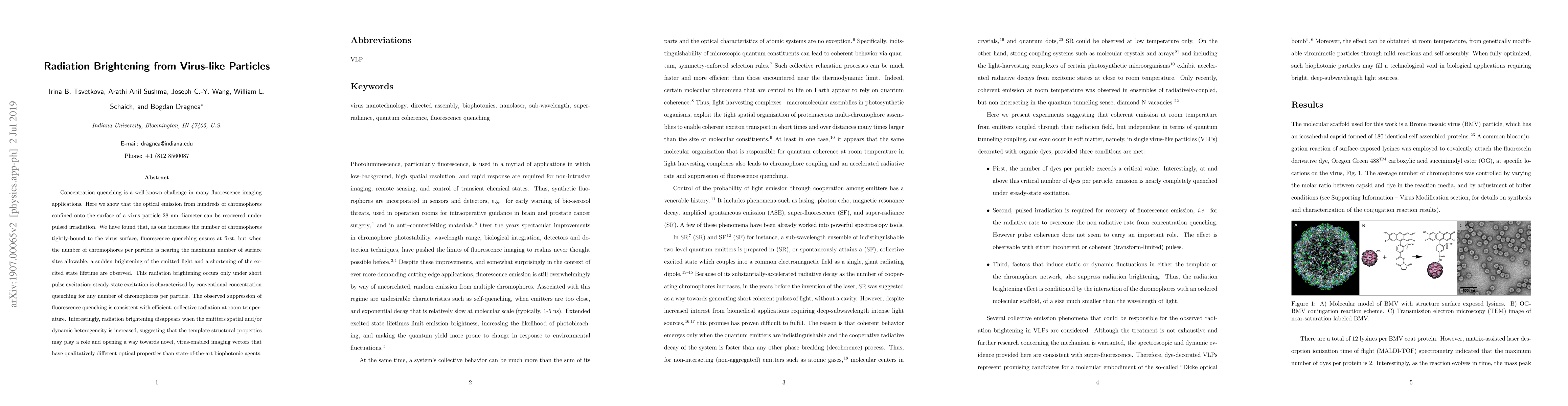 This research demonstrates that virus-like particles can counteract fluorescence quenching under pulsed irradiation, leading to brighter emission and shorter excited state lifetimes. This effect, called radiation brightening, is linked to efficient, collective relaxation and disappears with increased emitter heterogeneity, suggesting potential for novel imaging vectors with unique optical properties.
