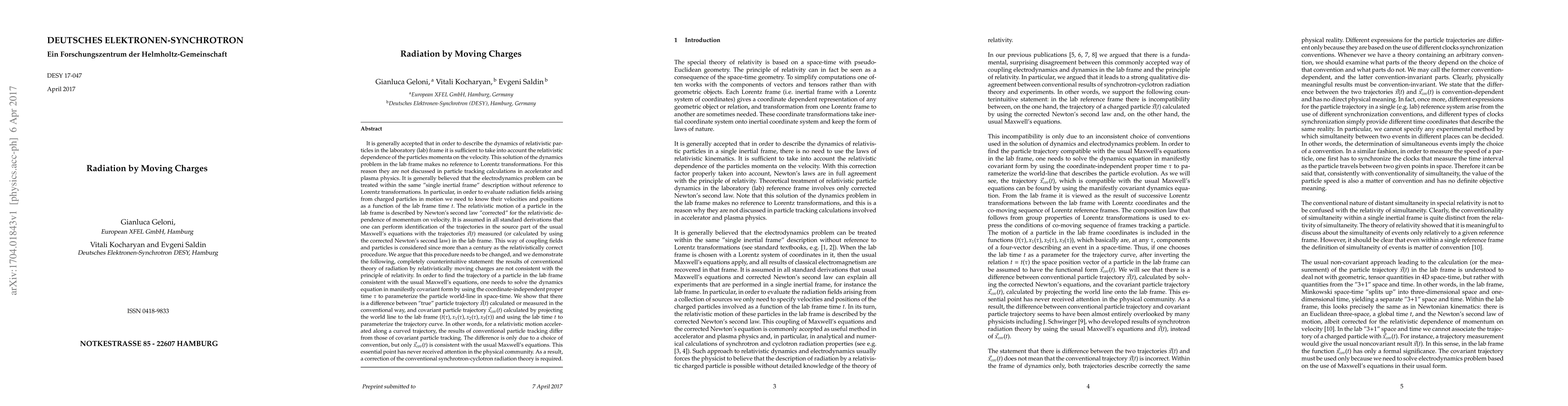 It is generally accepted that the dynamics of relativistic particles in the lab frame can be described by taking into account the relativistic dependence of the particles momenta on the velocity, with no reference to Lorentz transformations. The electrodynamics problem can then be treated within a "single inertial frame" description. To evaluate radiation fields from moving charged particles we need their velocities and positions as a function of the lab frame time t. The relativistic motion of a particle in the lab frame is described by Newton's second law corrected for the relativistic dependence of the particle momentum on the velocity. In all standard derivations the trajectories in the source part of the usual Maxwell's equations are identified with the trajectories $\vec{x}(t)$ calculated by using the "corrected" Newton's second law. This way of coupling fields and particles is considered correct. We argue that this procedure needs to be changed by demonstrating a counterintuitive: the results of conventional theory of radiation by relativistically moving charges are not consistent with the principle of relativity. The trajectory of a particle in the lab frame consistent with the usual Maxwell's equations, is found by solving the dynamics equation in manifestly covariant form, with the proper time $\tau$ used to parameterize the particle world-line in space-time. We find a difference between the "true" particle trajectory $\vec{x}(t)$ calculated or measured in the conventional way, and the covariant particle trajectory $\vec{x}_{cov}(t)$ calculated by projecting the world-line to the lab frame and using t to parameterize the trajectory curve. The difference is due to a choice of convention, but only $\vec{x}_{cov}(t)$ is consistent with the usual Maxwell's equations: therefore, a correction of the conventional synchrotron-cyclotron radiation theory is required.