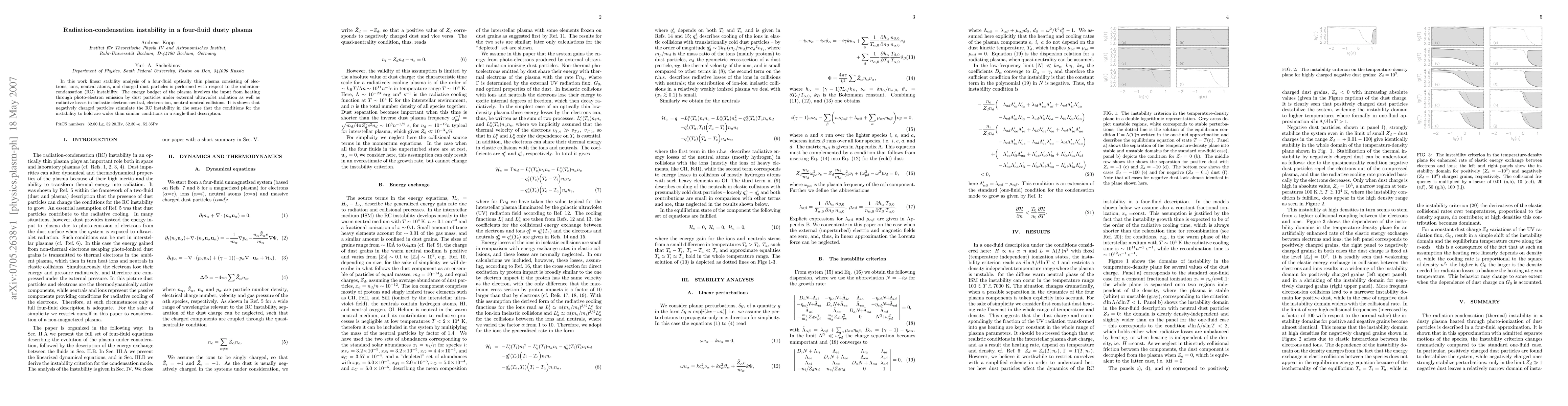 This paper conducts a linear stability analysis of a four-fluid dusty plasma, revealing that negatively charged dust particles enhance the radiation-condensation instability compared to single-fluid models. The study considers the energy dynamics involving photo-electron emission and radiative losses from various particle interactions.