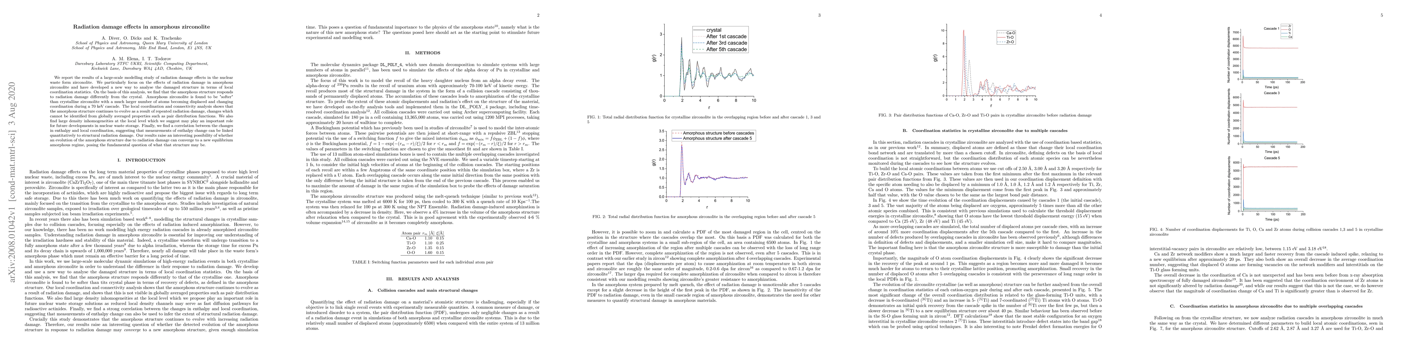 We report the results of a large-scale modelling study of radiation damage effects in the nuclear waste form zirconolite. We particularly focus on the effects of radiation damage in amorphous zirconolite and have developed a new way to analyse the damaged structure in terms of local coordination statistics. On the basis of this analysis, we find that the amorphous structure responds to radiation damage differently from the crystal. Amorphous zirconolite is found to be "softer" than crystalline zirconolite with a much larger number of atoms becoming displaced and changing coordination during a 70 keV cascade. The local coordination and connectivity analysis shows that the amorphous structure continues to evolve as a result of repeated radiation damage, changes which cannot be identified from globally averaged properties such as pair distribution functions. We also find large density inhomogeneities at the local level which we suggest may play an important role for future developments in nuclear waste storage. Finally, we find a correlation between the changes in enthalpy and local coordination, suggesting that measurements of enthalpy change can be linked quantitatively to structural radiation damage. Our results raise an interesting possibility of whether an evolution of the amorphous structure due to radiation damage can converge to a new equilibrium amorphous regime, posing the fundamental question of what that structure may be.