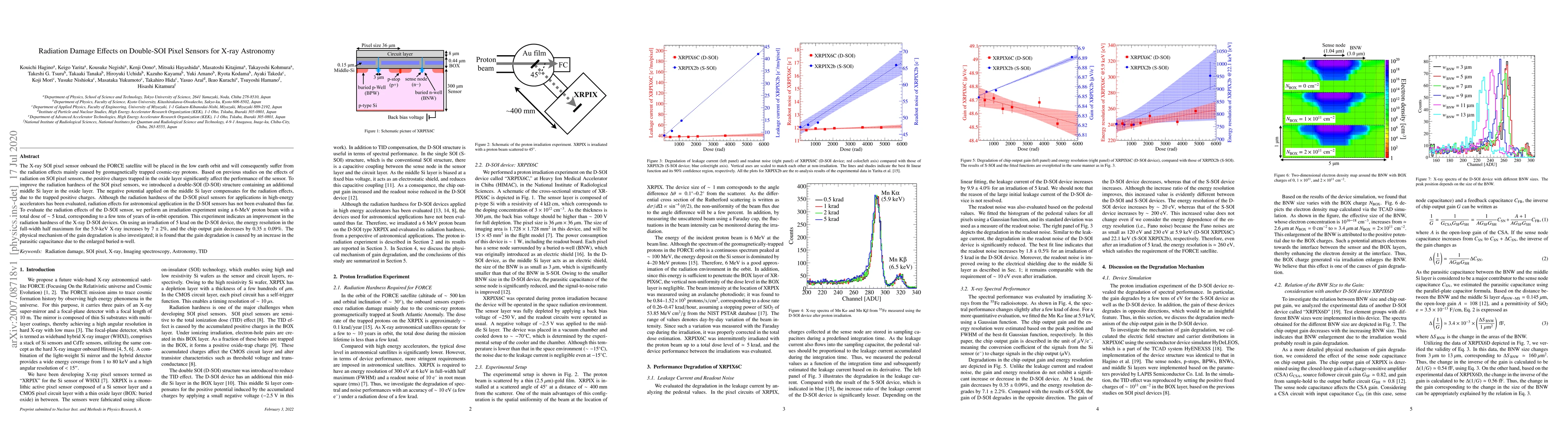 The X-ray SOI pixel sensor onboard the FORCE satellite will be placed in the low earth orbit and will consequently suffer from the radiation effects mainly caused by geomagnetically trapped cosmic-ray protons. Based on previous studies on the effects of radiation on SOI pixel sensors, the positive charges trapped in the oxide layer significantly affect the performance of the sensor. To improve the radiation hardness of the SOI pixel sensors, we introduced a double-SOI (D-SOI) structure containing an additional middle Si layer in the oxide layer. The negative potential applied on the middle Si layer compensates for the radiation effects, due to the trapped positive charges. Although the radiation hardness of the D-SOI pixel sensors for applications in high-energy accelerators has been evaluated, radiation effects for astronomical application in the D-SOI sensors has not been evaluated thus far. To evaluate the radiation effects of the D-SOI sensor, we perform an irradiation experiment using a 6-MeV proton beam with a total dose of ~ 5 krad, corresponding to a few tens of years of in-orbit operation. This experiment indicates an improvement in the radiation hardness of the X- ray D-SOI devices. On using an irradiation of 5 krad on the D-SOI device, the energy resolution in the full-width half maximum for the 5.9-keV X-ray increases by 7 $\pm$ 2%, and the chip output gain decreases by 0.35 $\pm$ 0.09%. The physical mechanism of the gain degradation is also investigated; it is found that the gain degradation is caused by an increase in the parasitic capacitance due to the enlarged buried n-well.