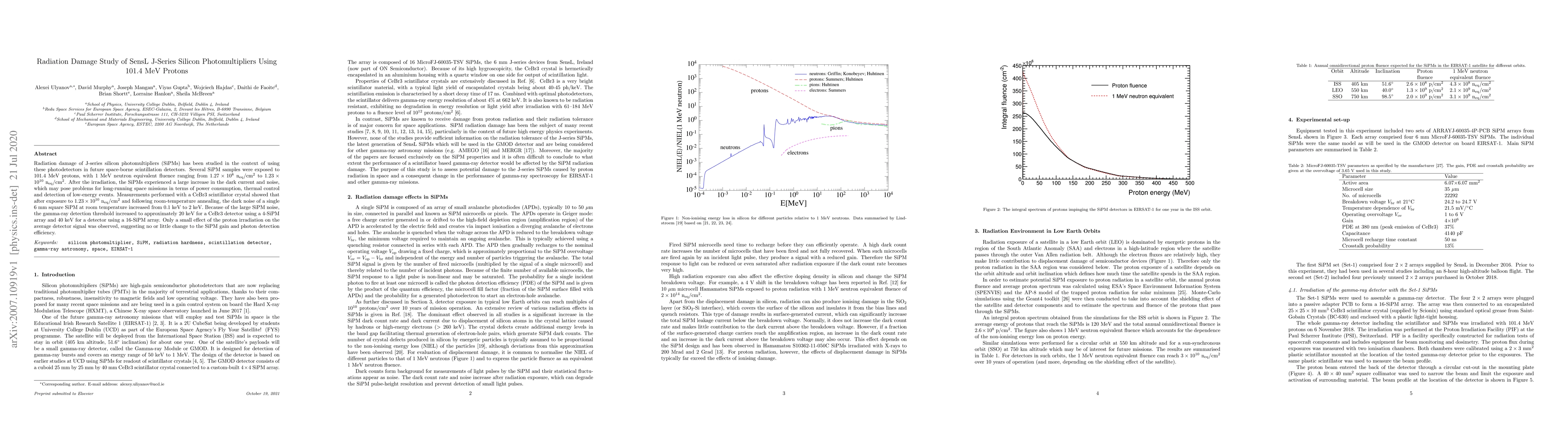 Radiation damage from proton irradiation causes a significant increase in dark current and noise in J-series silicon photomultipliers, potentially affecting space missions.