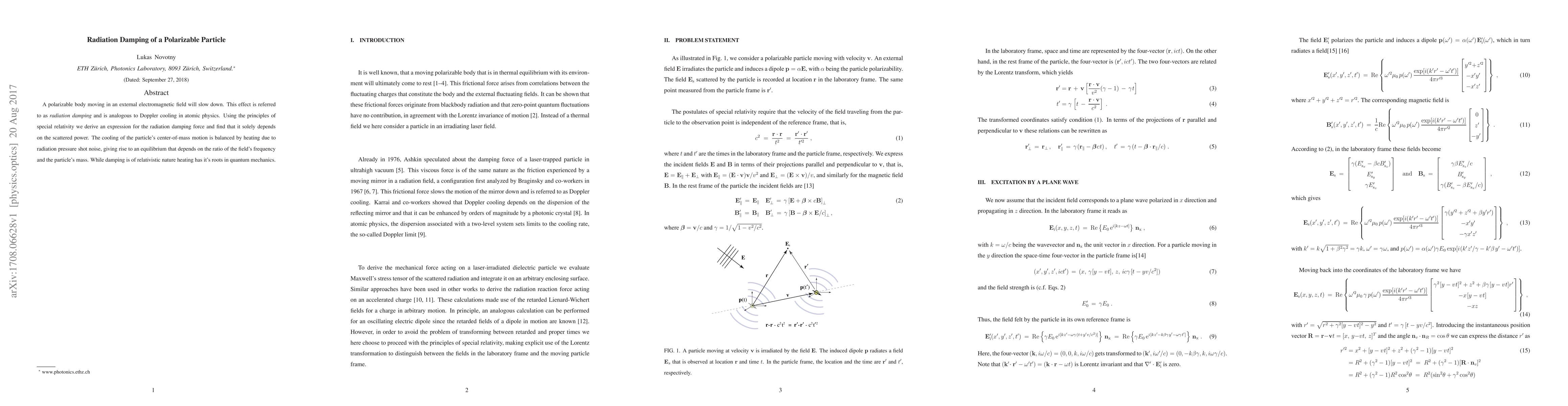 A polarizable body moving in an external electromagnetic field will slow down. This effect is referred to as radiation damping and is analogous to Doppler cooling in atomic physics. Using the principles of special relativity we derive an expression for the radiation damping force and find that it solely depends on the scattered power. The cooling of the particle's center-of-mass motion is balanced by heating due to radiation pressure shot noise, giving rise to an equilibrium that depends on the ratio of the field's frequency and the particle's mass. While damping is of relativistic nature heating has it's roots in quantum mechanics.
