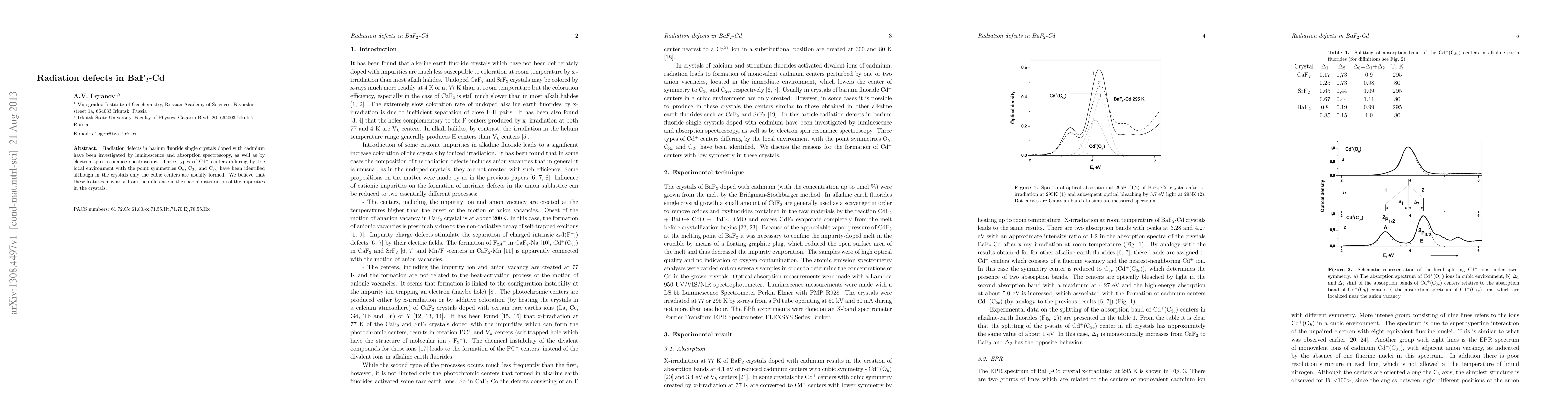 Radiation defects in barium fluoride single crystals doped with cadmium have been investigated by luminescence and absorption spectroscopy, as well as by electron spin resonance spectroscopy. Three types of Cd$^+$ centers differing by the local environment with the point symmetries O$_h$, C$_3$$_v$ and C$_2$$_v$ have been identified although in the crystals only the cubic centers are usually formed. We believe that these features may arise from the difference in the spacial distribution of the impurities in the crystals.