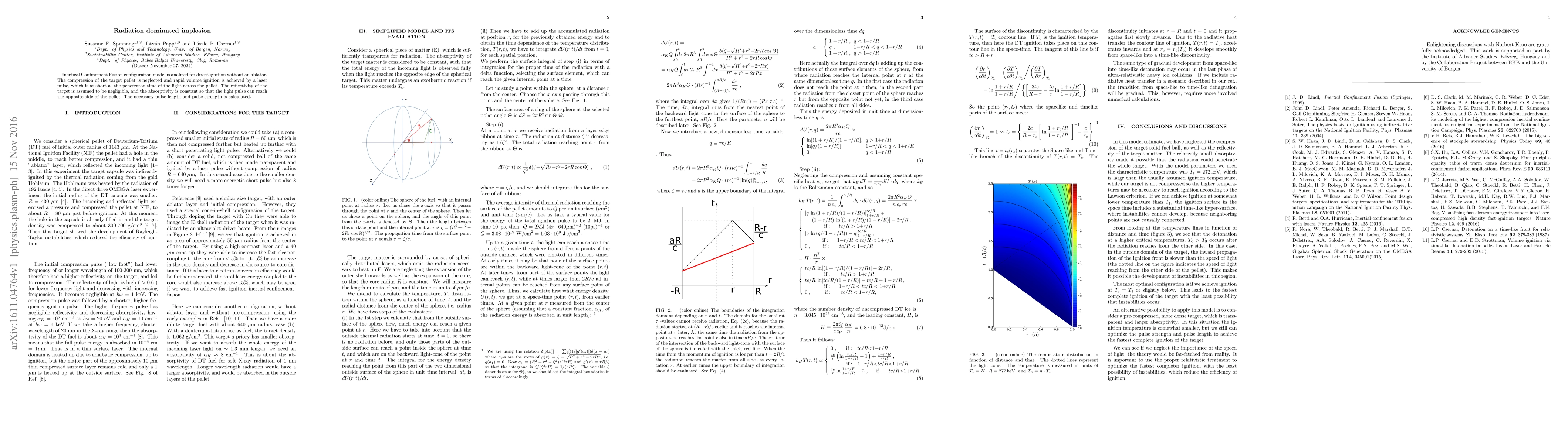 Inertical Confinement Fusion configuration model is analized for direct ignition without an ablator. The compression of the target pellet is neglected and rapid volume ignition is achieved by a laser pulse, which is as short as the penetraton time of the light across the pellet. The reflectivity of the target is assumed to be negligible, and the absorptivity is constant so that the light pulse can reach the opposite side of the pellet. The necessary pulse length and pulse strength is calculated.