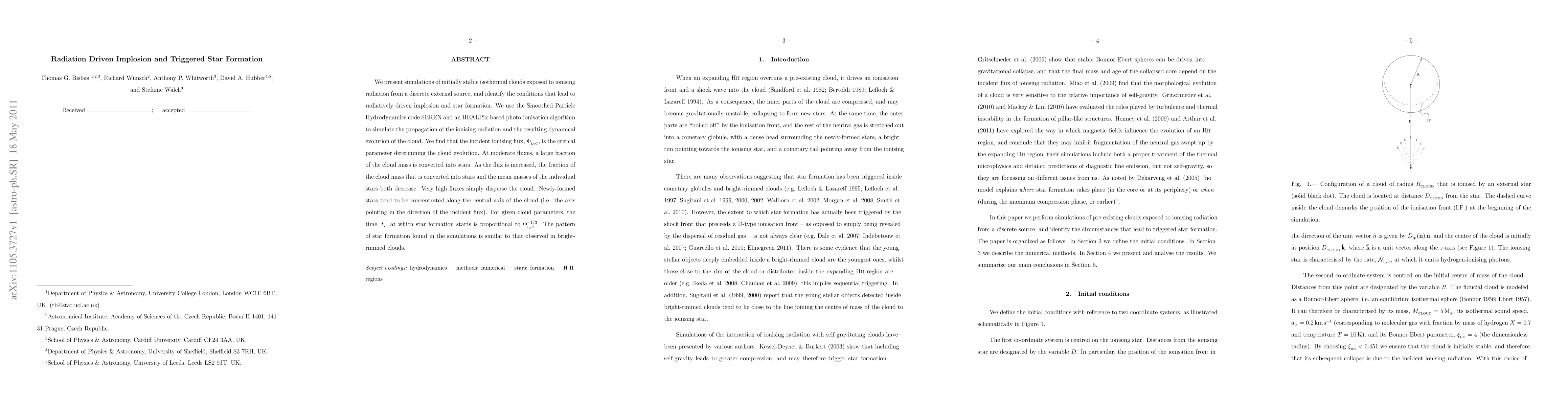 This paper uses simulations to explore how ionising radiation from an external source can trigger star formation in initially stable clouds. It finds that moderate ionising flux leads to significant star formation, while very high flux disperses the cloud.