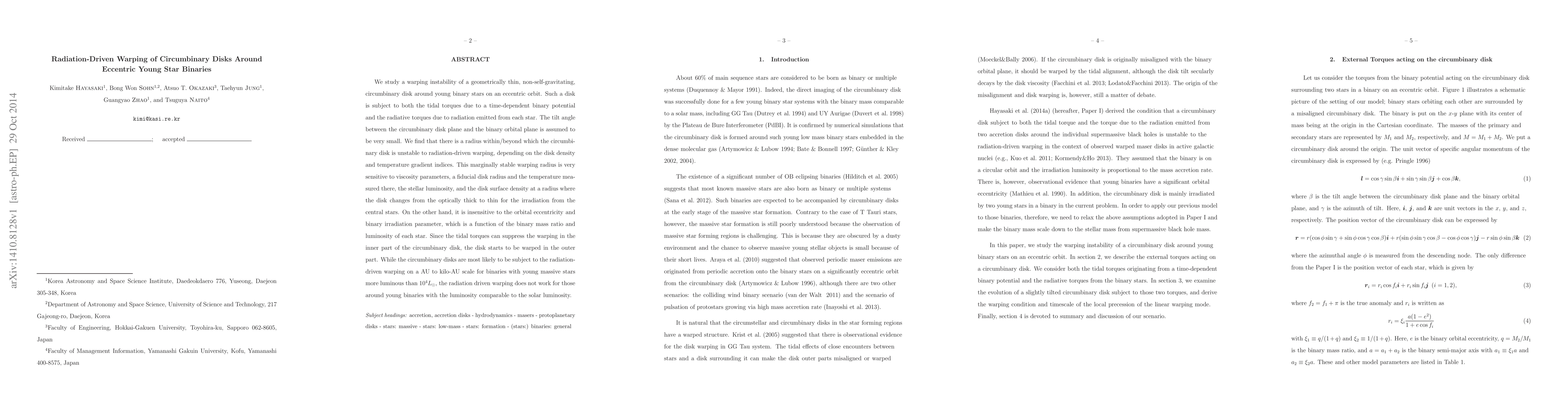 This paper investigates the radiation-driven warping instability of circumbinary disks around young, eccentric binary stars, finding a radius where warping becomes unstable depending on disk properties and stellar luminosity. The warping is sensitive to disk density, temperature gradients, and viscosity parameters, but not to orbital eccentricity.