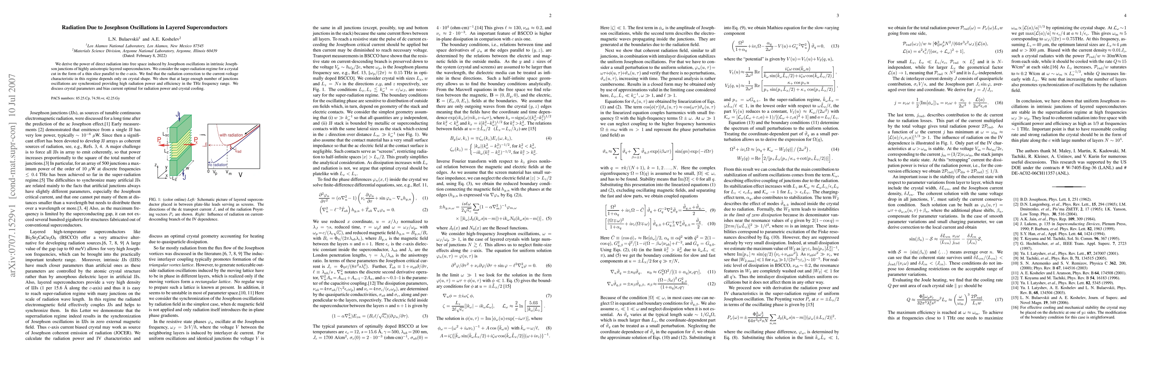 This paper derives the power of radiation from Josephson oscillations in layered superconductors, finding that the radiation's effect on the current-voltage characteristic depends on the crystal shape. It shows that high radiation power and efficiency in the THz range can be achieved when oscillations in numerous junctions are synchronized, and discusses optimal conditions for maximum radiation power and crystal cooling.