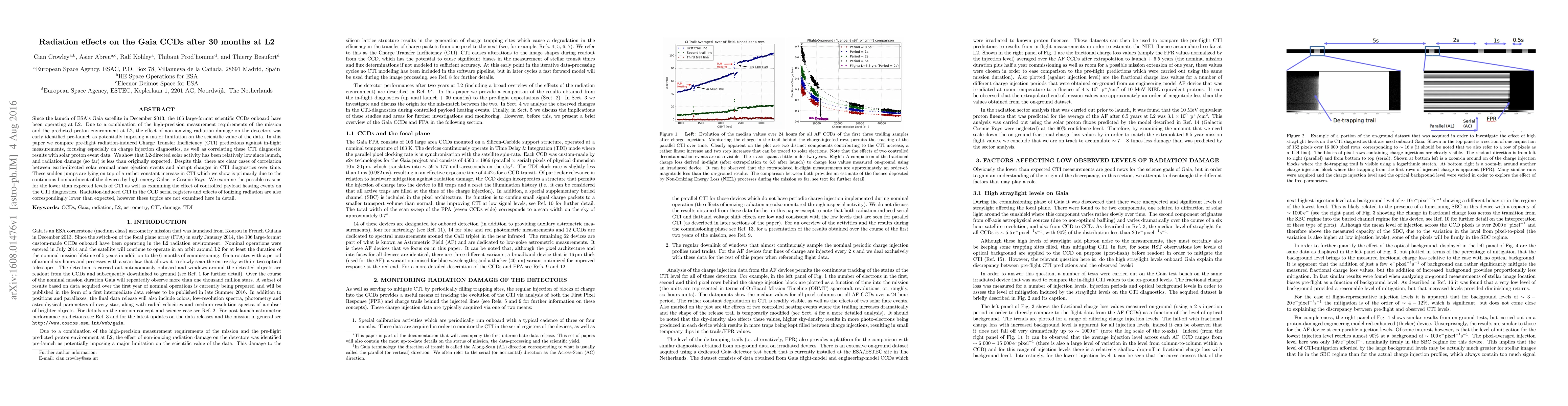 Since the launch of ESA's Gaia satellite in December 2013, the 106 large-format scientific CCDs onboard have been operating at L2. Due to a combination of the high-precision measurement requirements of the mission and the predicted proton environment at L2, the effect of non-ionizing radiation damage on the detectors was early identified pre-launch as potentially imposing a major limitation on the scientific value of the data. In this paper we compare pre-flight radiation-induced Charge Transfer Inefficiency (CTI) predictions against in-flight measurements, focusing especially on charge injection diagnostics, as well as correlating these CTI diagnostic results with solar proton event data. We show that L2-directed solar activity has been relatively low since launch, and radiation damage (so far) is less than originally expected. Despite this, there are clear cases of correlation between earth-directed solar coronal mass ejection events and abrupt changes in CTI diagnostics over time. These sudden jumps are lying on top of a rather constant increase in CTI which we show is primarily due to the continuous bombardment of the devices by high-energy Galactic Cosmic Rays. We examine the possible reasons for the lower than expected levels of CTI as well as examining the effect of controlled payload heating events on the CTI diagnostics. Radiation-induced CTI in the CCD serial registers and effects of ionizing radiation are also correspondingly lower than expected, however these topics are not examined here in detail.