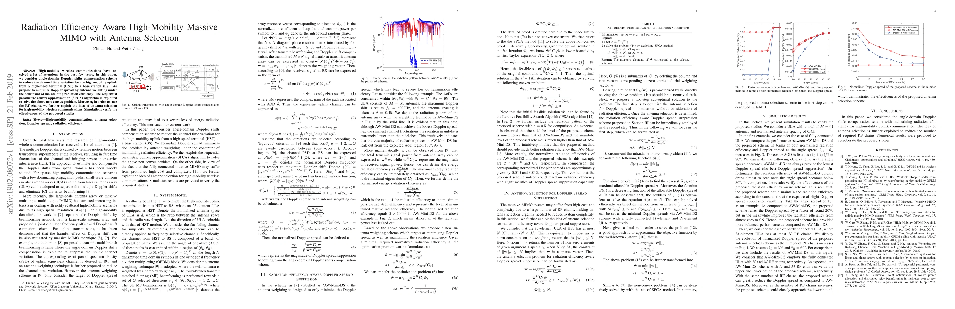 This paper explores a Doppler shift compensation scheme for high-mobility uplink communications, aiming to minimize Doppler spread while maintaining radiation efficiency through antenna weighting. It employs the SPCA algorithm and antenna selection to optimize performance, with simulations confirming the proposed method's effectiveness.