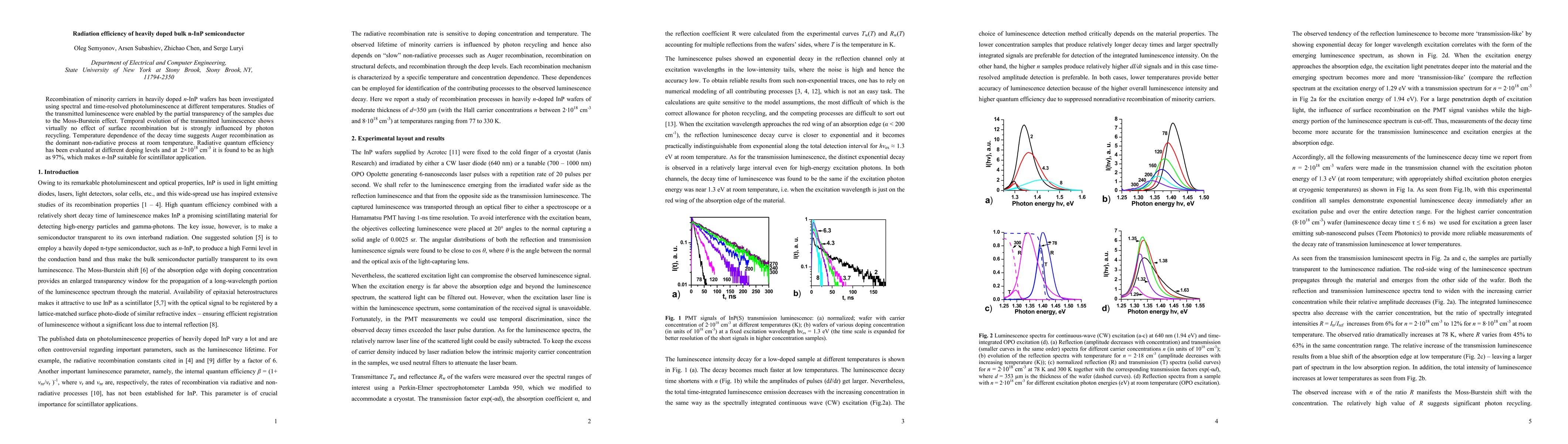 This study investigates the recombination mechanisms in heavily doped n-InP semiconductor wafers, revealing that photon recycling significantly influences the temporal evolution of transmitted luminescence. The radiative quantum efficiency reaches 97% at a doping level of 2x10^18 cm^-3, indicating n-InP's suitability for scintillator applications.