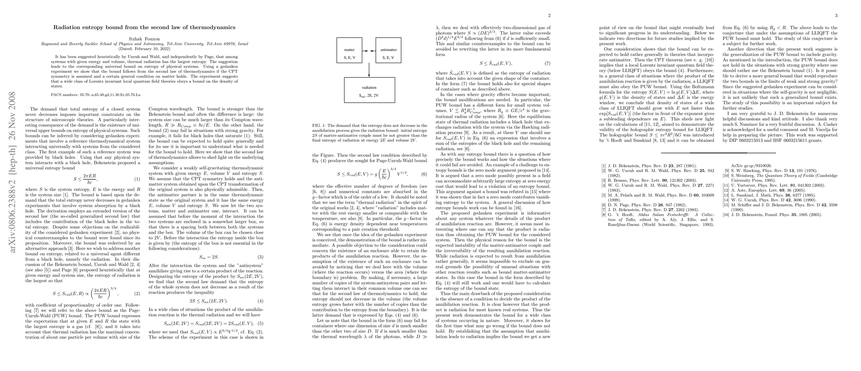 It has been suggested heuristically by Unruh and Wald, and independently by Page, that among systems with given energy and volume, thermal radiation has the largest entropy. The suggestion leads to the corresponding universal bound on entropy of physical systems. Using a gedanken experiment we show that the bound follows from the second law of thermodynamics if the CPT symmetry is assumed and a certain general condition on matter holds. The experiment suggests that a wide class of Lorentz invariant local quantum field theories obeys a bound on the density of states.