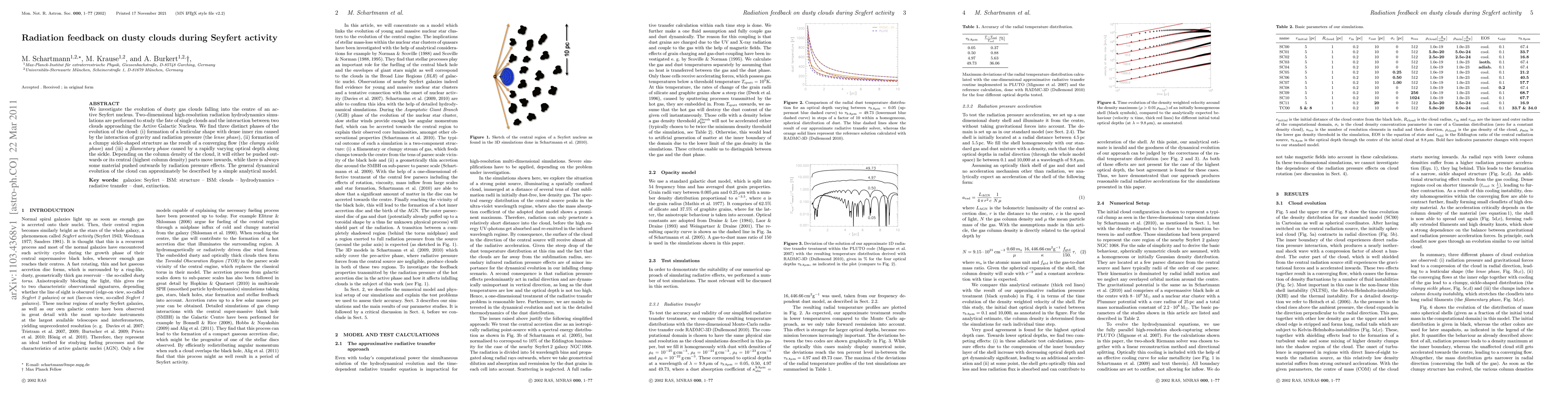 This paper uses high-resolution radiation hydrodynamics simulations to study the evolution of dusty gas clouds in the vicinity of an active Seyfert nucleus, identifying three phases: a lense phase, a clumpy sickle phase, and a filamentary phase, with radiation pressure influencing the cloud's dynamics and determining its eventual trajectory.