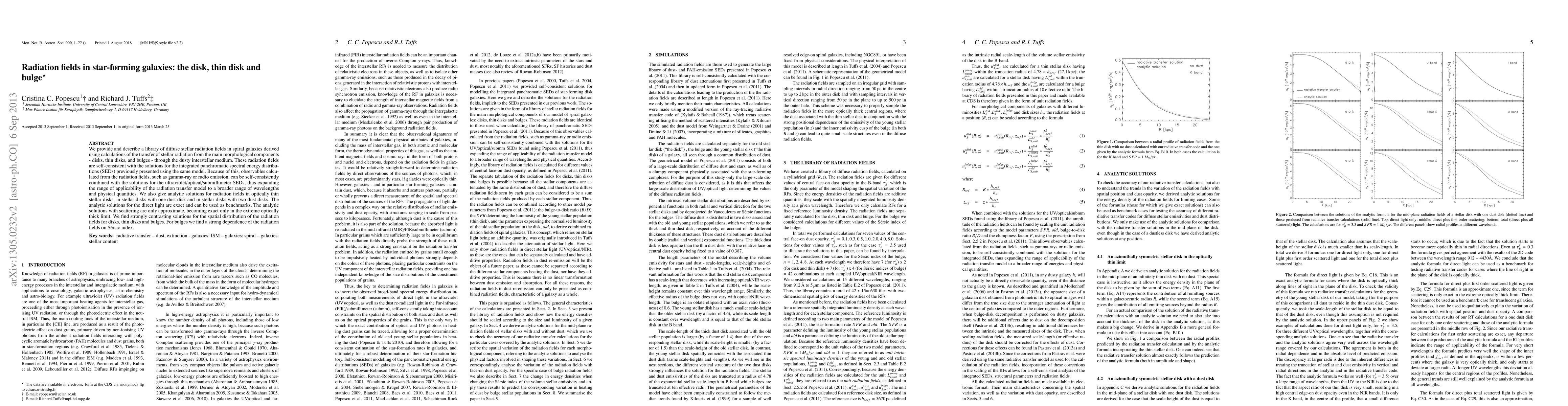 This paper presents a library of diffuse stellar radiation fields in spiral galaxies, derived from calculations of radiation transfer through disks, thin disks, and bulges. The radiation fields are self-consistent with integrated spectral energy distributions, allowing for combined analysis across various wavelengths, and provide analytic solutions for different disk and dust configurations.