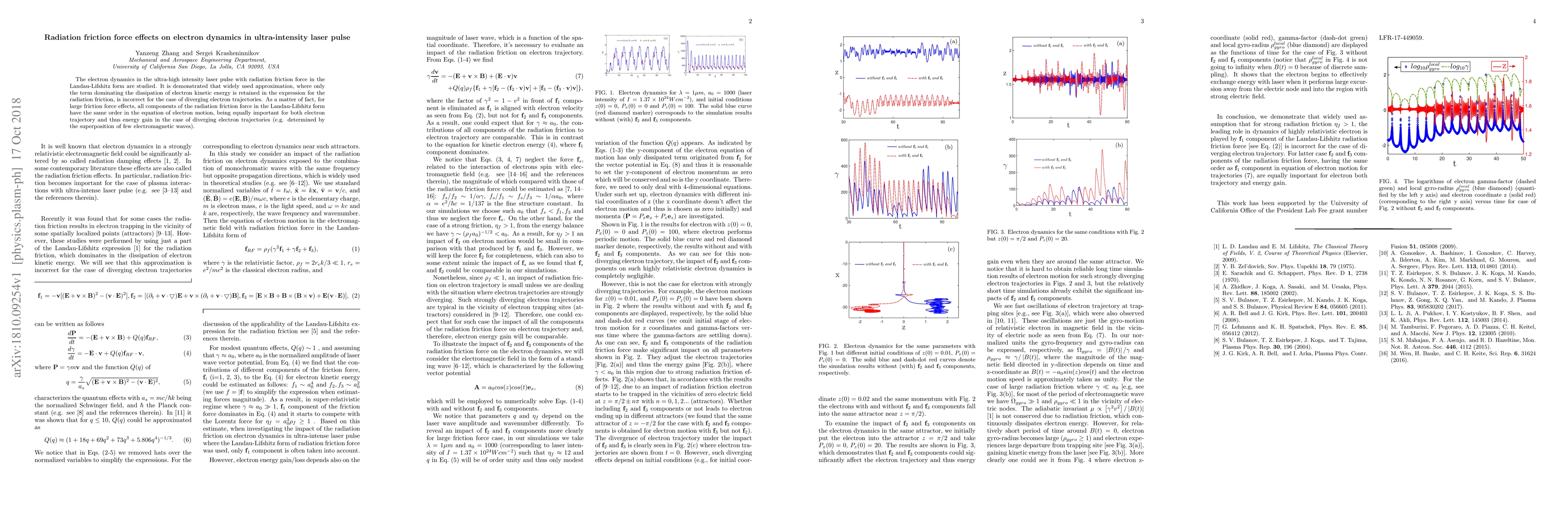 The electron dynamics in the ultra-high intensity laser pulse with radiation friction force in theLandau-Lifshitz form are studied. It is demonstrated that widely used approximation, where onlythe term dominating the dissipation of electron kinetic energy is retained in the expression for theradiation friction, is incorrect for the case of diverging electron trajectories. As a matter of fact, forlarge friction force effects, all components of the radiation friction force in the Landau-Lifshitz formhave the same order in the equation of electron motion, being equally important for both electrontrajectory and thus energy gain in the case of diverging electron trajectories (e.g. determined bythe superposition of few electromagnetic waves).