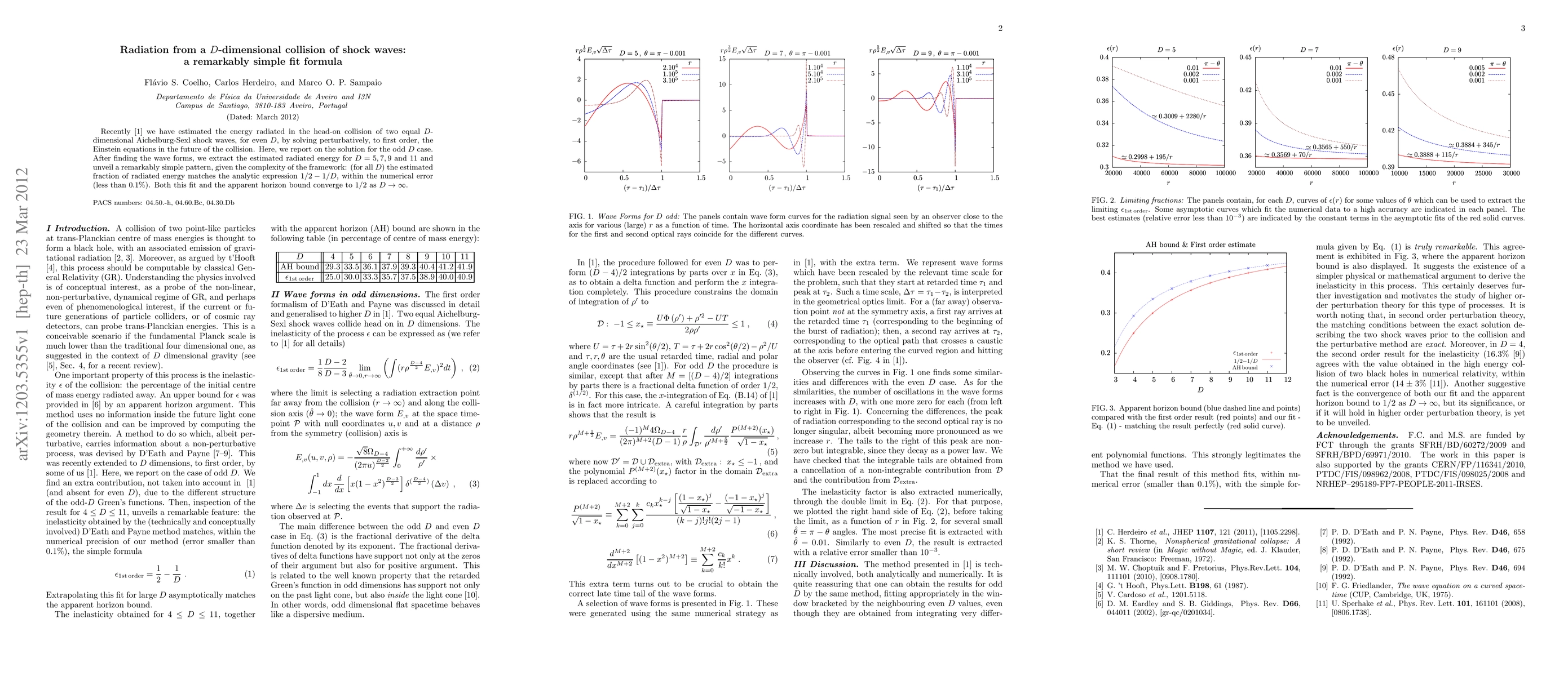 Recently, in arXiv:1105.2298 [hep-th], we have estimated the energy radiated in the head-on collision of two equal D-dimensional Aichelburg-Sexl shock waves, for even D, by solving perturbatively, to first order, the Einstein equations in the future of the collision. Here, we report on the solution for the odd D case. After finding the wave forms, we extract the estimated radiated energy for D=5,7,9 and 11 and unveil a remarkably simple pattern, given the complexity of the framework: (for all D) the estimated fraction of radiated energy matches the analytic expression 1/2-1/D, within the numerical error (less than 0.1%). Both this fit and the apparent horizon bound converge to 1/2 as D goes to infinity.