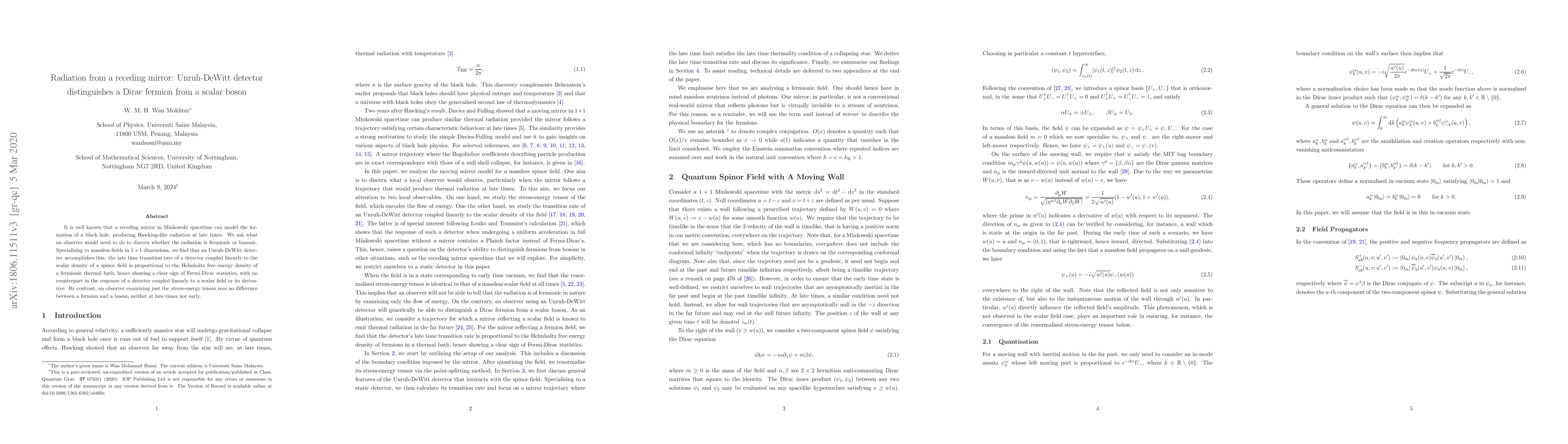 Summary: An Unruh-DeWitt detector can distinguish Hawking radiation from a Dirac fermion from that of a scalar boson by showing a transition rate proportional to Fermi-Dirac statistics, while the stress-energy tensor reveals no such difference.