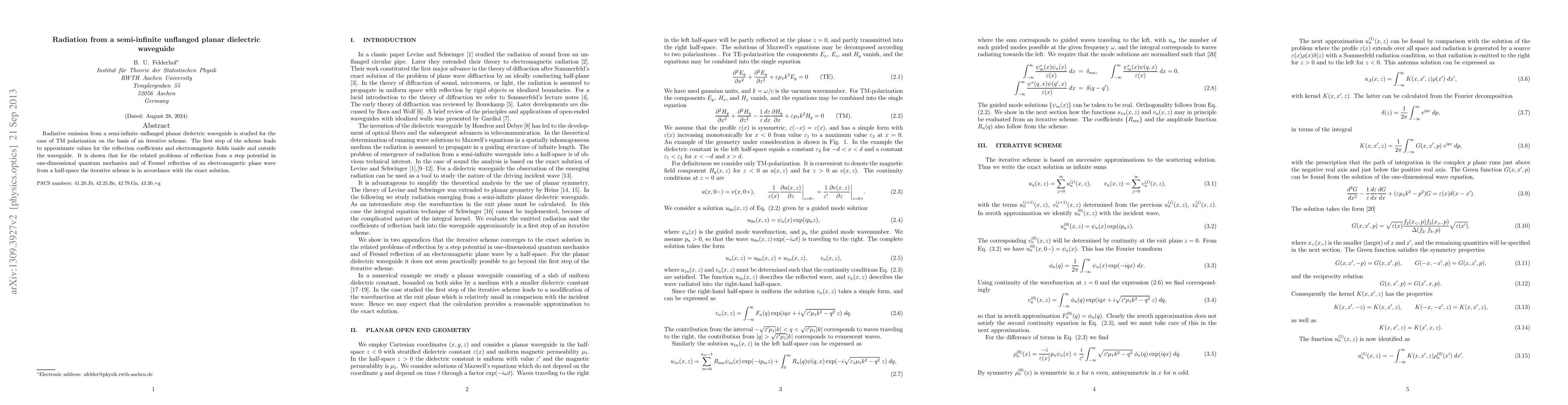 Radiative emission from an open-ended unflanged planar dielectric waveguide is studied for the case of TM polarization on the basis of an iterative scheme. The first step of the scheme leads to approximate values for the reflection coefficients and electromagnetic fields inside and outside the waveguide. It is shown that for the related problems of reflection from a step potential in one-dimensional quantum mechanics and of Fresnel reflection of an electromagnetic plane wave from a half-space the iterative scheme is in accordance with the exact solution.