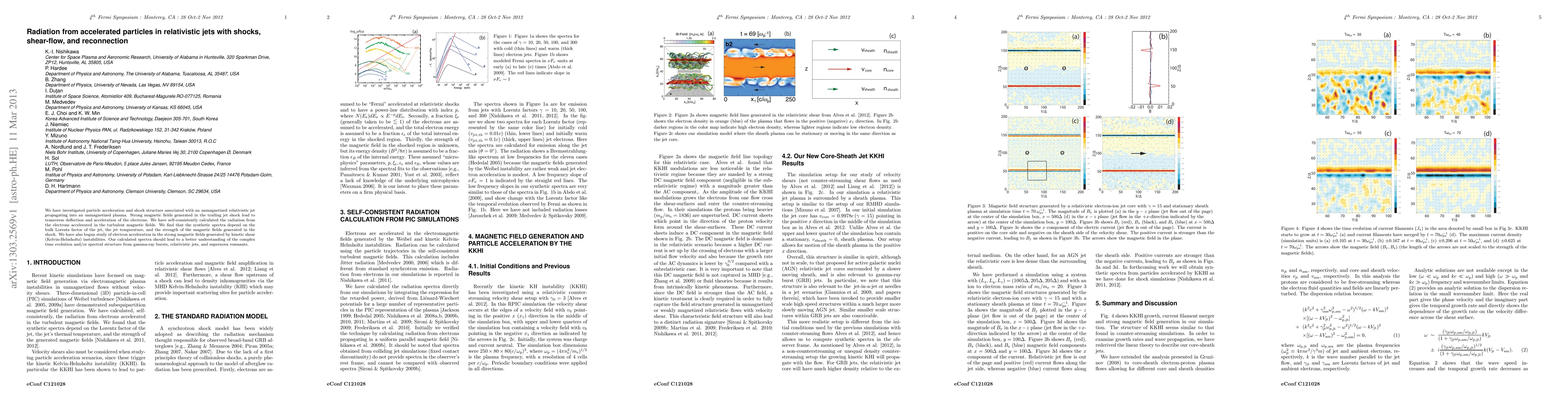 We have investigated particle acceleration and shock structure associated with an unmagnetized relativistic jet propagating into an unmagnetized plasma. Strong magnetic fields generated in the trailing jet shock lead to transverse deflection and acceleration of the electrons. We have self-consistently calculated the radiation from the electrons accelerated in the turbulent magnetic fields. We find that the synthetic spectra depend on the bulk Lorentz factor of the jet, the jet temperature, and the strength of the magnetic fields generated in the shock. We have also begun study of electron acceleration in the strong magnetic fields generated by kinetic shear (Kelvin-Helmholtz) instabilities. Our calculated spectra should lead to a better understanding of the complex time evolution and/or spectral structure from gamma-ray bursts, relativistic jets, and supernova remnants.
