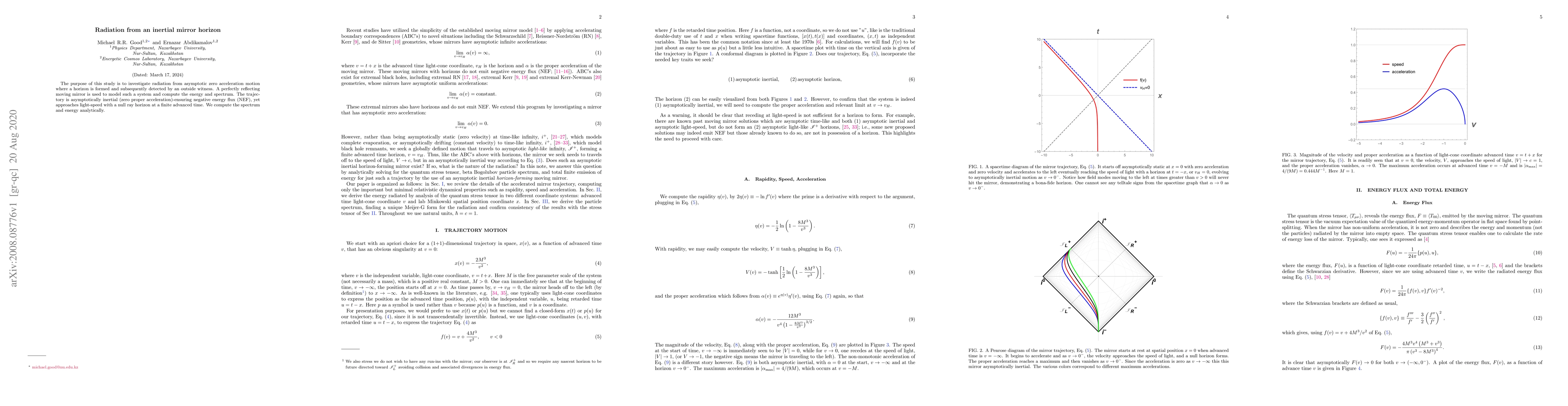 This study investigates radiation from a perfectly reflecting inertial mirror approaching light-speed, forming a null ray horizon, and computes its energy and spectrum analytically, ensuring negative energy flux. The findings provide insights into the radiation detected by an outside observer.