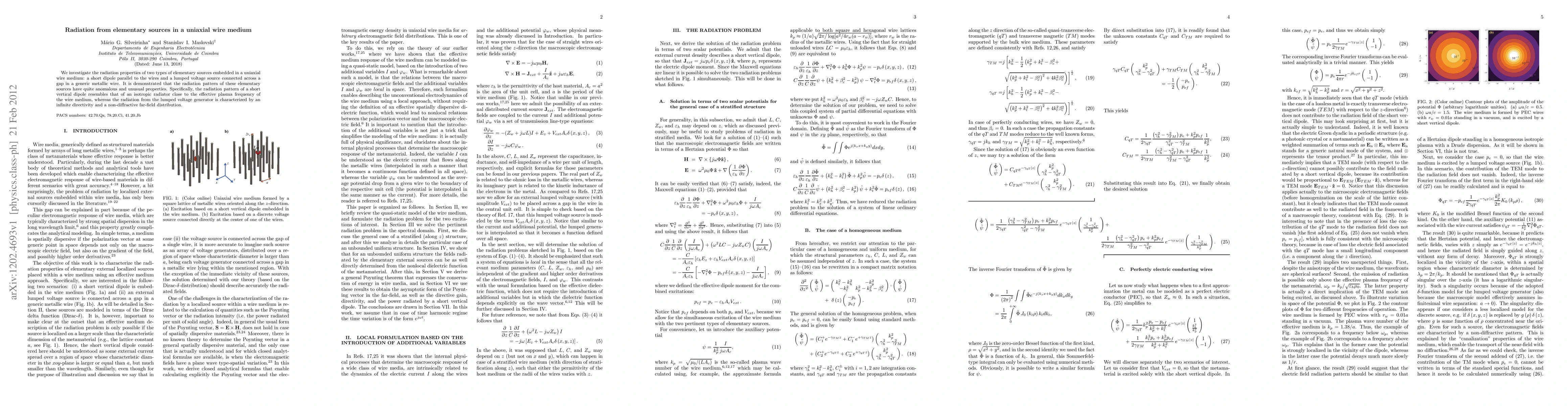 A study investigates radiation patterns from two elementary sources in a uniaxial wire medium, revealing unusual properties including isotropic radiator behavior near the effective plasma frequency and infinite directivity.