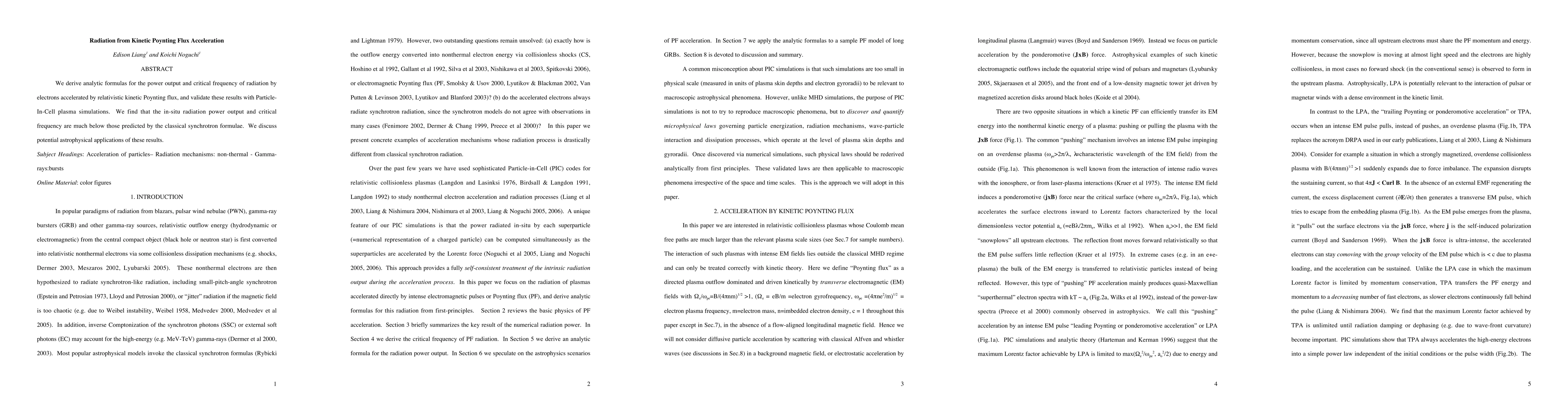 Researchers derived new formulas for radiation power output and critical frequency in relativistic kinetic Poynting flux acceleration, finding them to be lower than classical synchrotron predictions.