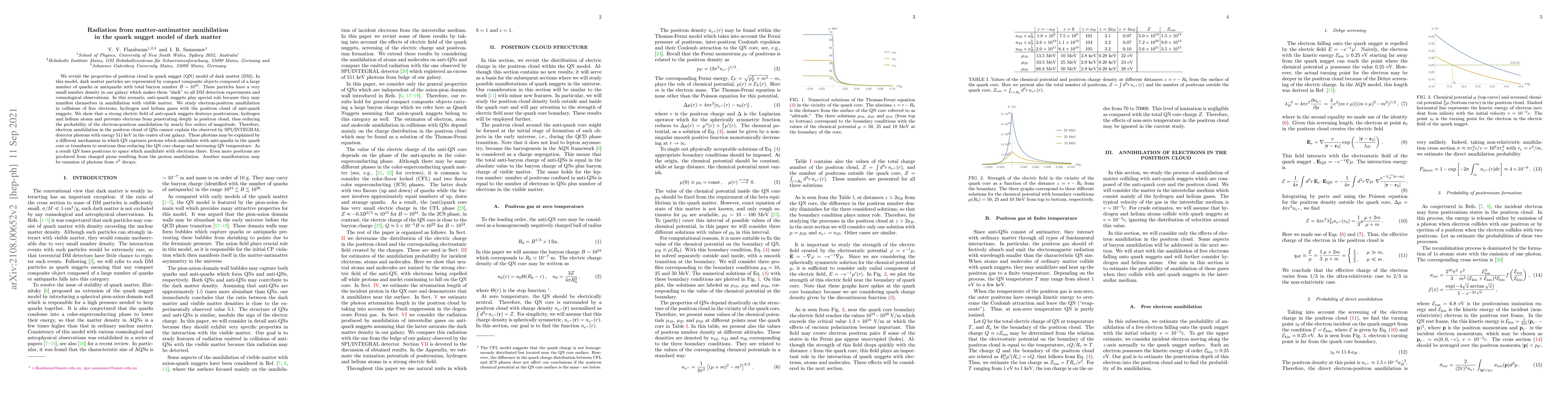 We revisit the properties of positron cloud in quark nugget (QN) model of dark matter (DM). In this model, dark matter particles are represented by compact composite objects composed of a large number of quarks or antiquarks with total baryon number $B\sim 10^{24}$. These particles have a very small number density in our galaxy which makes them "dark" to all DM detection experiments and cosmological observations. In this scenario, anti-quark nuggets play special role because they may manifest themselves in annihilation with visible matter. We study electron-positron annihilation in collisions of free electrons, hydrogen and helium gases with the positron cloud of anti-quark nuggets. We show that a strong electric field of anti-quark nuggets destroys positronium, hydrogen and helium atoms and prevents electrons from penetrating deeply in positron cloud, thus reducing the probability of the electron-positron annihilation by nearly five orders of magnitude. Therefore, electron annihilation in the positron cloud of QNs cannot explain the observed by SPI/INTEGRAL detector photons with energy 511 keV in the center of our galaxy. These photons may be explained by a different mechanism in which QN captures protons which annihilate with anti-quarks in the quark core or transform to neutrons thus reducing the QN core charge and increasing QN temperature. As a result QN loses positrons to space which annihilate with electrons there. Even more positrons are produced from charged pions resulting from the proton annihilation. Another manifestation may be emission of photons from $\pi^0$ decays.