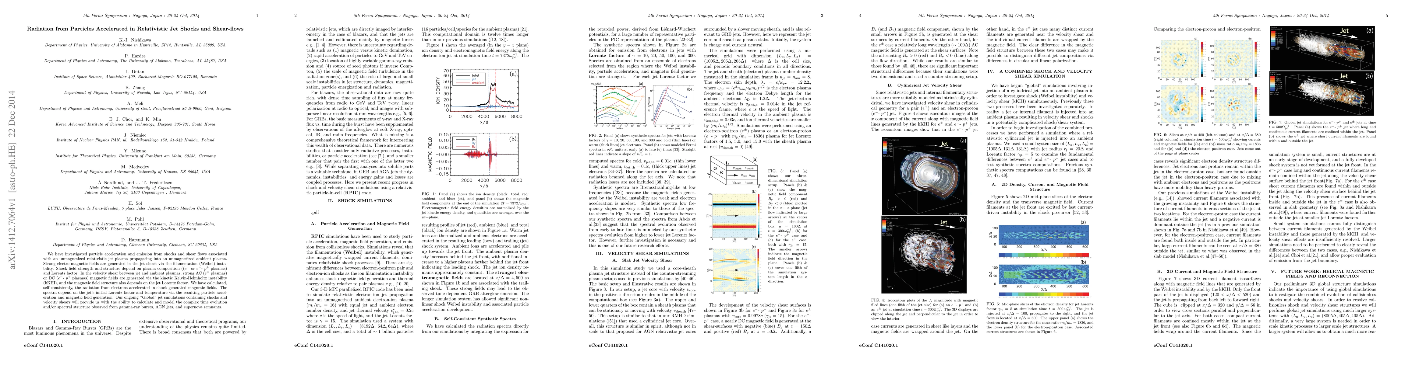 We have investigated particle acceleration and emission from shocks and shear flows associated with an unmagnetized relativistic jet plasma propagating into an unmagnetized ambient plasma. Strong electro-magnetic fields are generated in the jet shock via the filamentation (Weibel) instability. Shock field strength and structure depend on plasma composition (($e^{\pm}$ or $e^-$- $p^+$ plasmas) and Lorentz factor. In the velocity shear between jet and ambient plasmas, strong AC ($e^{\pm}$ plasmas) or DC ($e^-$- $p^+$ plasmas) magnetic fields are generated via the kinetic Kelvin-Helmholtz instability (kKHI), and the magnetic field structure also depends on the jet Lorentz factor. We have calculated, self-consistently, the radiation from electrons accelerated in shock generated magnetic fields. The spectra depend on the jet's initial Lorentz factor and temperature via the resulting particle acceleration and magnetic field generation. Our ongoing "Global" jet simulations containing shocks and velocity shears will provide us with the ability to calculate and model the complex time evolution and/or spectral structure observed from gamma-ray bursts, AGN jets, and supernova remnants.