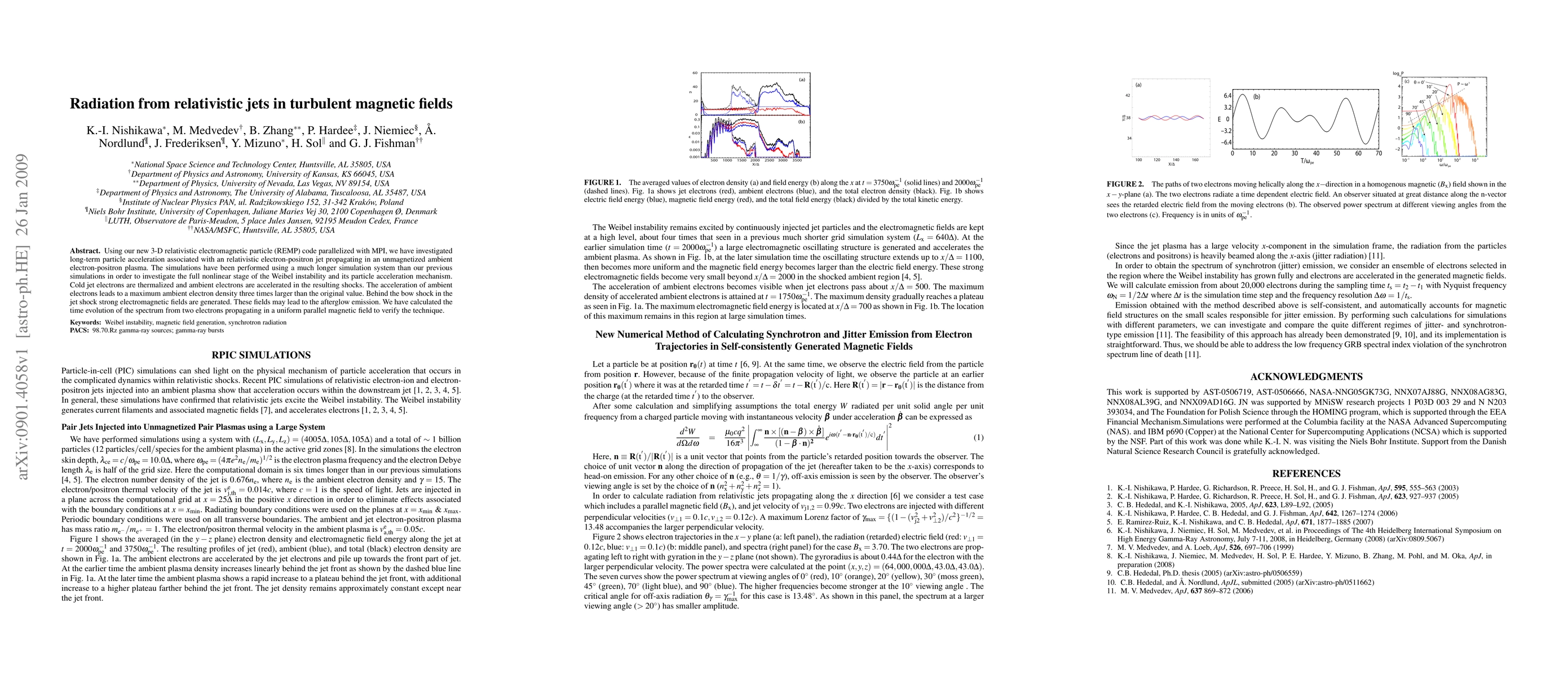 Using our new 3-D relativistic electromagnetic particle (REMP) code parallelized with MPI, we have investigated long-term particle acceleration associated with an relativistic electron-positron jet propagating in an unmagnetized ambient electron-positron plasma. The simulations have been performed using a much longer simulation system than our previous simulations in order to investigate the full nonlinear stage of the Weibel instability and its particle acceleration mechanism. Cold jet electrons are thermalized and ambient electrons are accelerated in the resulting shocks. The acceleration of ambient electrons leads to a maximum ambient electron density three times larger than the original value. Behind the bow shock in the jet shock strong electromagnetic fields are generated. These fields may lead to the afterglow emission. We have calculated the time evolution of the spectrum from two electrons propagating in a uniform parallel magnetic field to verify the technique.
