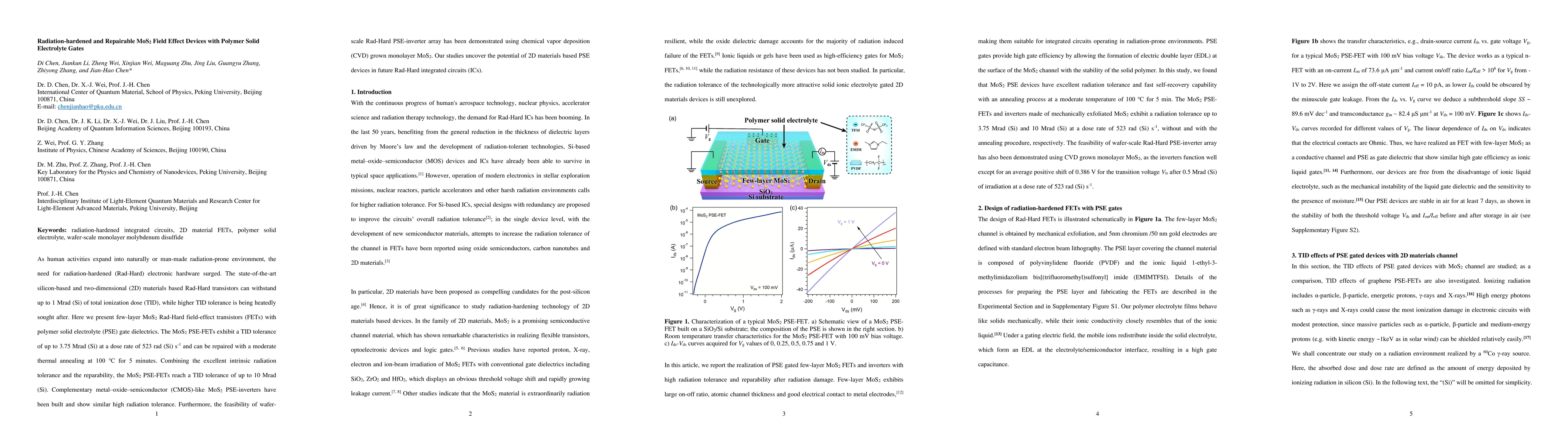 This paper introduces radiation-hardened few-layer MoS$_2$ field-effect transistors with polymer solid electrolyte gates, achieving a tolerance of up to 3.75 Mrad (Si) and reparability through thermal annealing, thus potentially reaching a TID tolerance of 10 Mrad (Si). CMOS-like inverters made from these materials demonstrate high radiation tolerance and feasibility for wafer-scale integrated circuits.