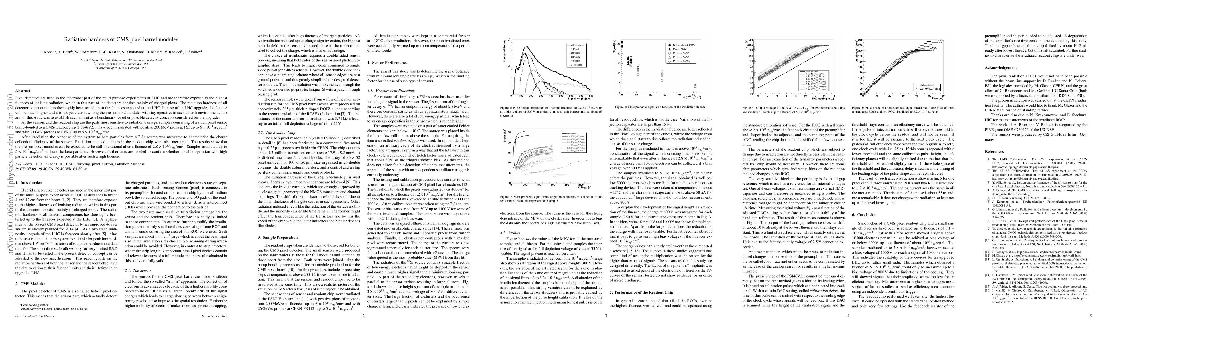 This study investigates the radiation hardness of CMS pixel barrel modules, focusing on their operational limits under high fluences of ionising radiation, primarily charged pions. Results indicate that the current modules can operate reliably up to a fluence of 2.8E15 Neq, but further tests are required to confirm stability and efficiency at higher fluences.