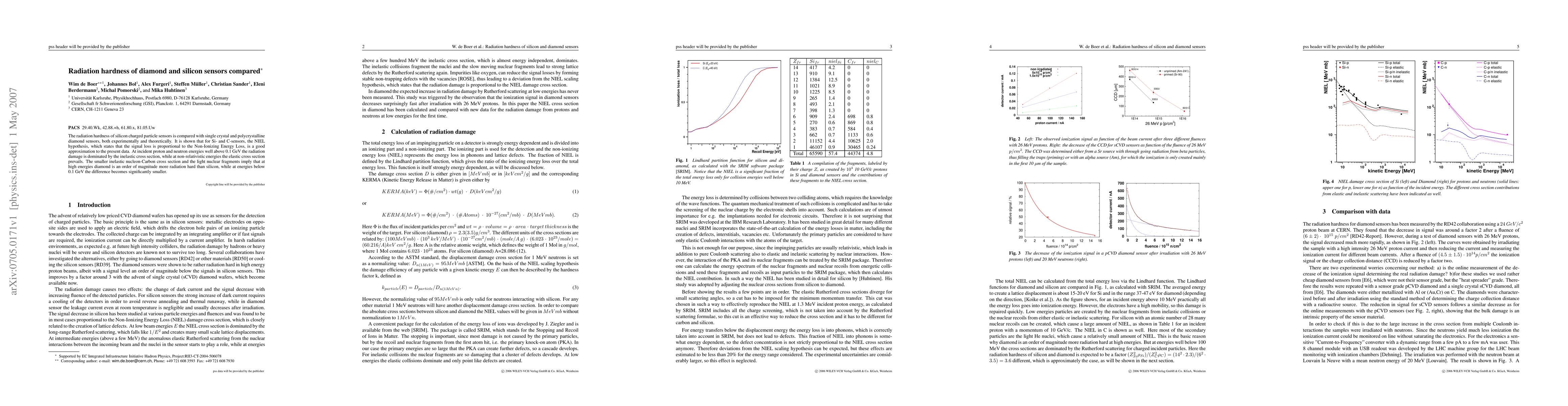This paper compares the radiation hardness of silicon and diamond sensors, showing that diamond is significantly more radiation-hard at high energies due to its smaller inelastic nucleon-Carbon cross section, while the difference diminishes at lower energies. The NIEL hypothesis effectively approximates the signal loss in both materials.