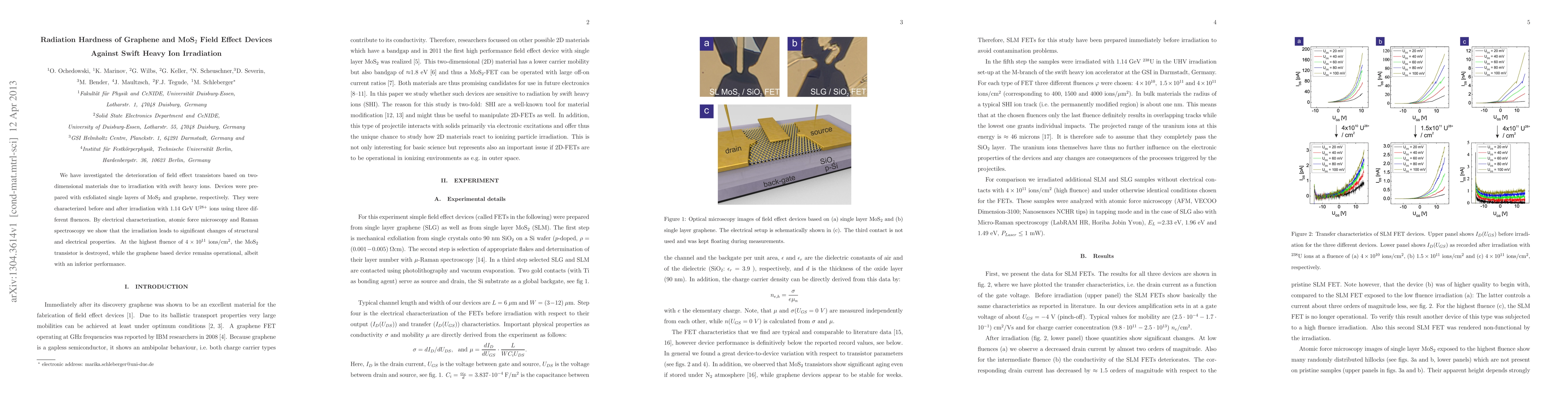 We have investigated the deterioration of field effect transistors based on twodimensional materials due to irradiation with swift heavy ions. Devices were prepared with exfoliated single layers of MoS2 and graphene, respectively. They were characterized before and after irradiation with 1.14 GeV U228+2 ions using three different fluences. By electrical characterization, atomic force microscopy and Raman spectroscopy we show that the irradiation leads to significant changes of structural and electrical properties. At the highest fluence of 4 x 102^11 ions/cm^2, the MoS2 transistor is destroyed, while the graphene based device remains operational, albeit with an inferior performance.
