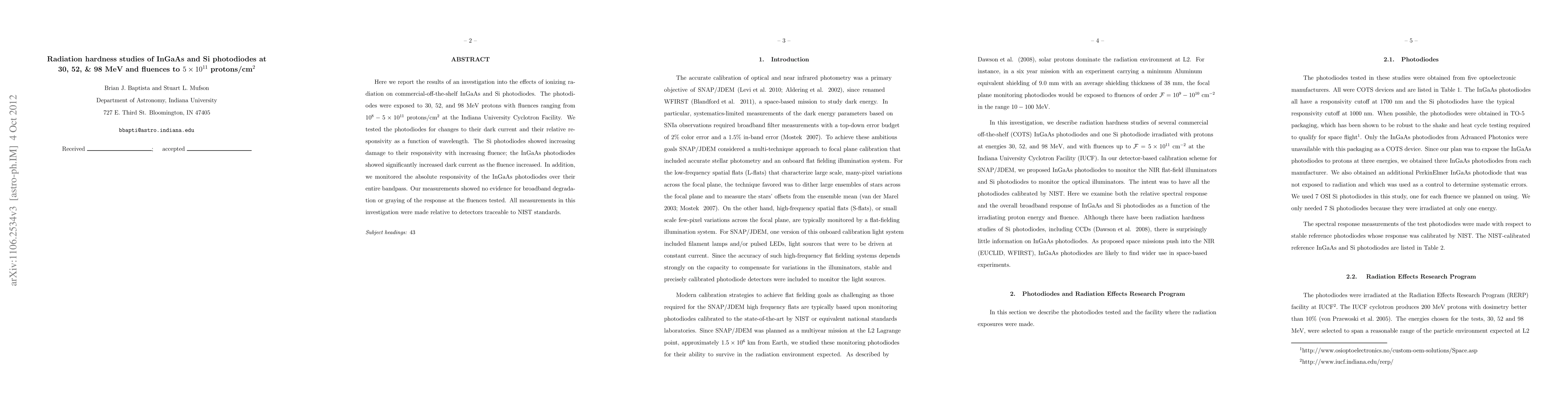 Here we report the results of an investigation into the effects of ionizing radiation on commercial-off-the-shelf InGaAs and Si photodiodes. The photodiodes were exposed to 30, 52, and 98 MeV protons with fluences ranging from 10^8 - 5x10^11 protons/cm^2 at the Indiana University Cyclotron Facility. We tested the photodiodes for changes to their dark current and their relative responsivity as a function of wavelength. The Si photodiodes showed increasing damage to their responsivity with increasing fluence; the InGaAs photodiodes showed significantly increased dark current as the fluence increased. In addition, we monitored the absolute responsivity of the InGaAs photodiodes over their entire bandpass. Our measurements showed no evidence for broadband degradation or graying of the response at the fluences tested. All measurements in this investigation were made relative to detectors traceable to NIST standards.
