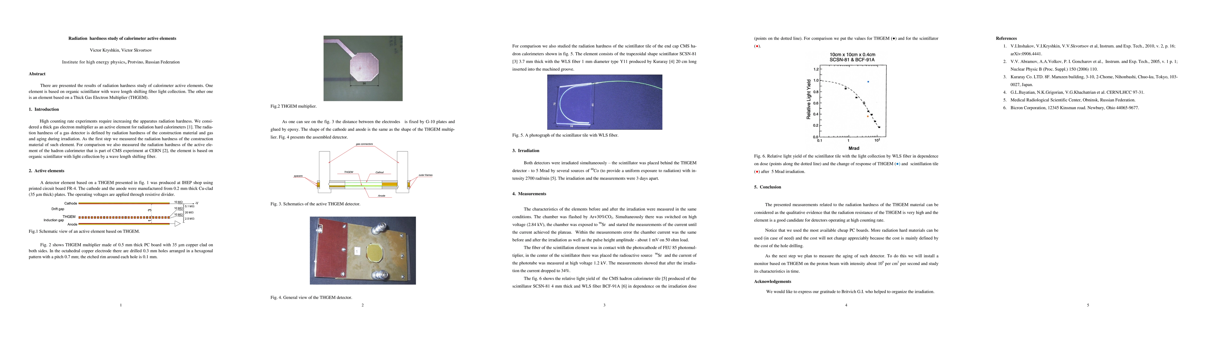 There are presented the results of radiation hardness study of calorimeter active elements. One element is based on organic scintillator with wave length shifting fiber light collection. The other one is an element based on a Thick Gas Electron Multiplier.