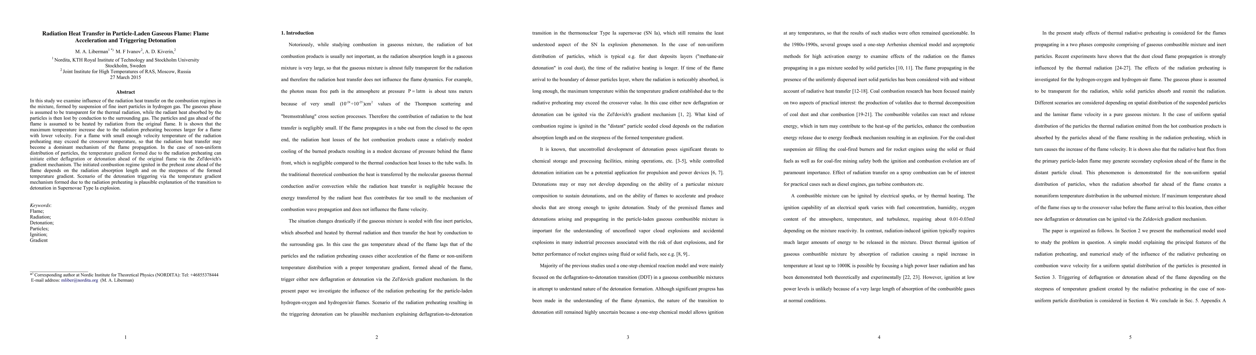 This study investigates the impact of radiation heat transfer on combustion regimes in a hydrogen gas mixture with suspended fine inert particles, revealing that lower flame velocities enhance radiation preheating. The research suggests that radiation can trigger deflagration or detonation through temperature gradients, providing a plausible mechanism for detonation initiation in Supernovae Type Ia explosions.