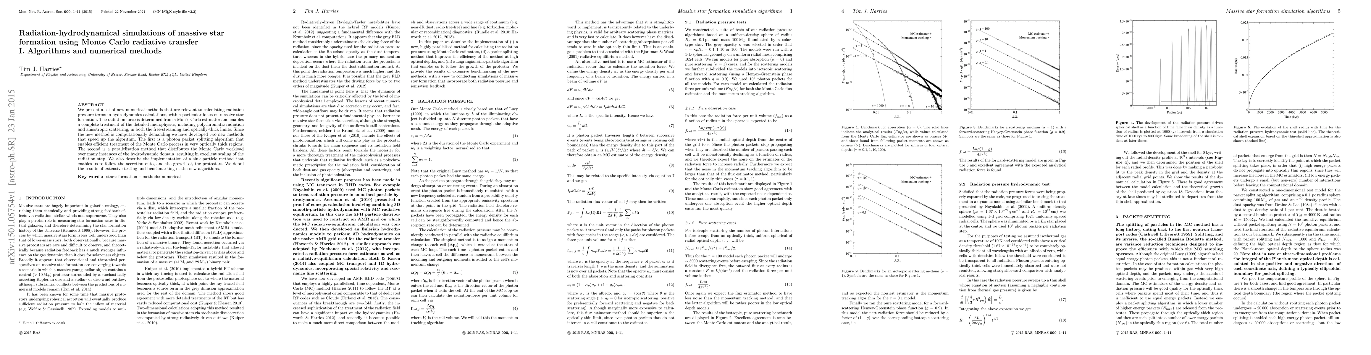 This paper introduces new numerical methods for radiation-hydrodynamical simulations of massive star formation, focusing on Monte Carlo radiative transfer. The authors develop efficient algorithms, including photon packet splitting and parallelization, to handle the computational demands and accurately model radiation pressure, polychromatic radiation, and anisotropic scattering.