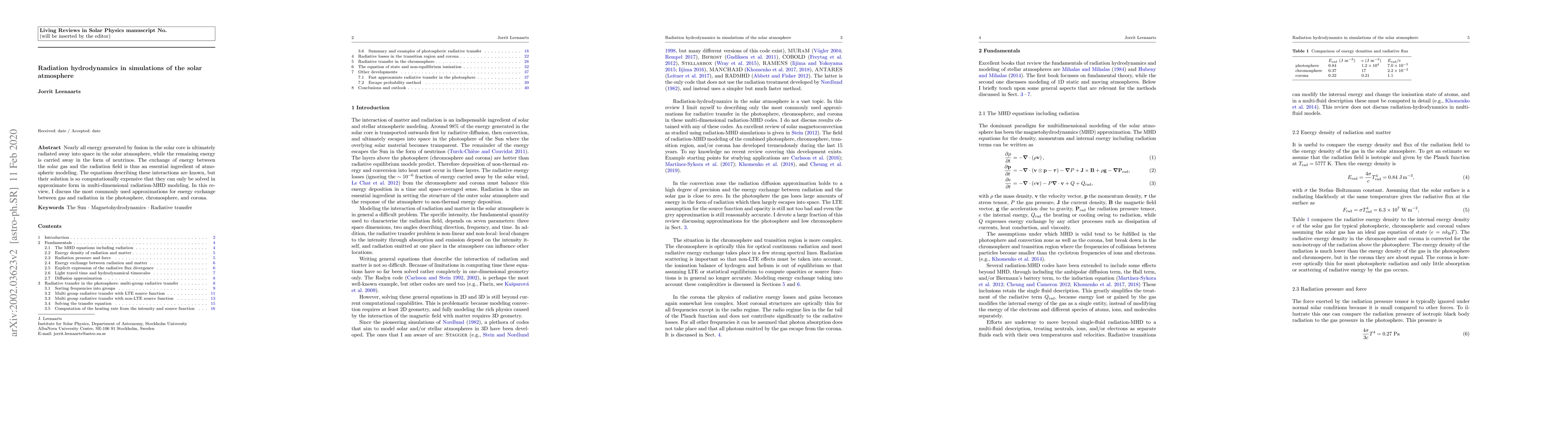 Nearly all energy generated by fusion in the solar core is ultimately radiated away into space in the solar atmosphere, while the remaining energy is carried away in the form of neutrinos. The exchange of energy between the solar gas and the radiation field is thus an essential ingredient of atmospheric modeling. The equations describing these interactions are known, but their solution is so computationally expensive that they can only be solved in approximate form in multi-dimensional radiation-MHD modeling. In this review, I discuss the most commonly used approximations for energy exchange between gas and radiation in the photosphere, chromosphere, and corona.