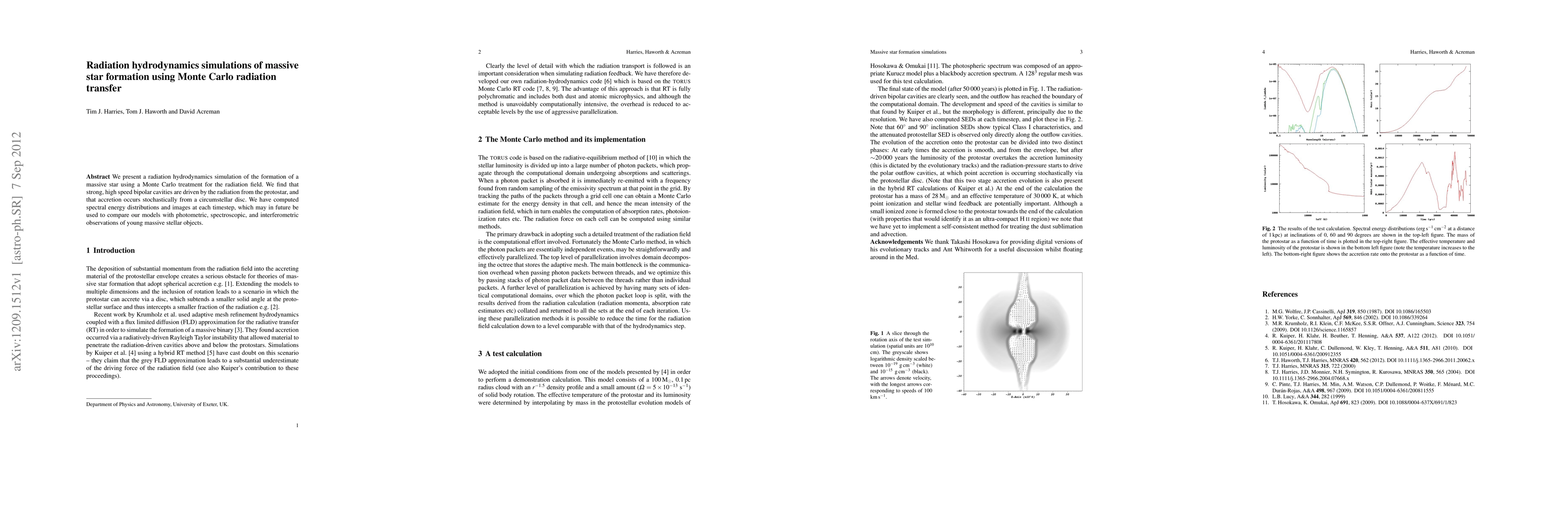 We present a radiation hydrodynamics simulation of the formation of a massive star using a Monte Carlo treatment for the radiation field. We find that strong, high speed bipolar cavities are driven by the radiation from the protostar, and that accretion occurs stochastically from a circumstellar disc. We have computed spectral energy distributions and images at each timestep, which may in future be used to compare our models with photometric, spectroscopic, and interferometric observations of young massive stellar objects.