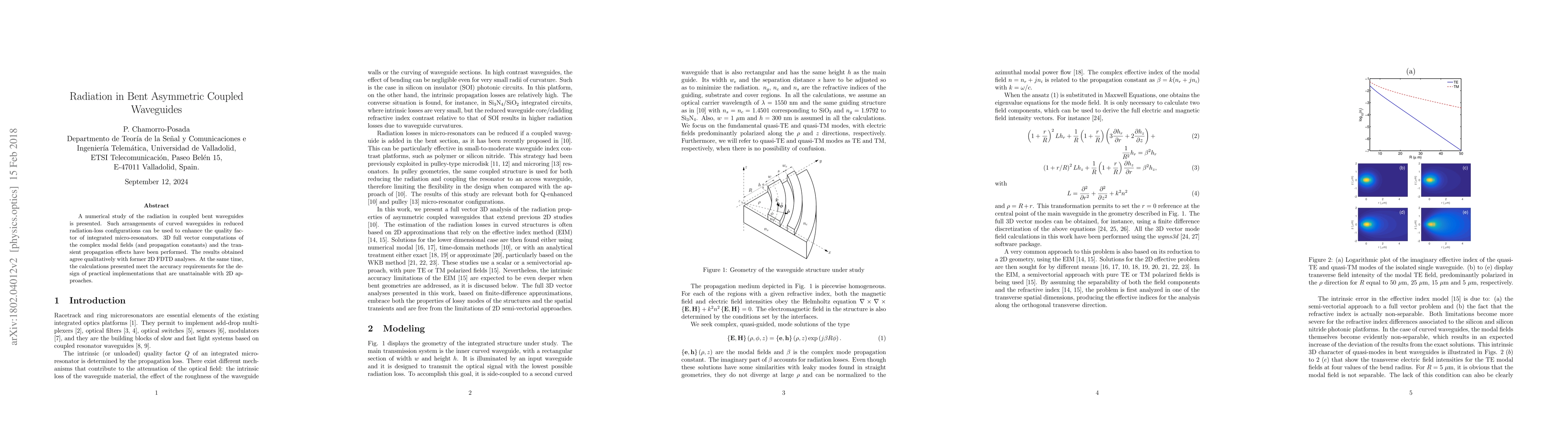 This paper presents a numerical study of radiation in bent asymmetric coupled waveguides using 3D full vector computations, showing enhanced quality factors for integrated micro-resonators and improved accuracy over 2D FDTD analyses for practical design implementations.