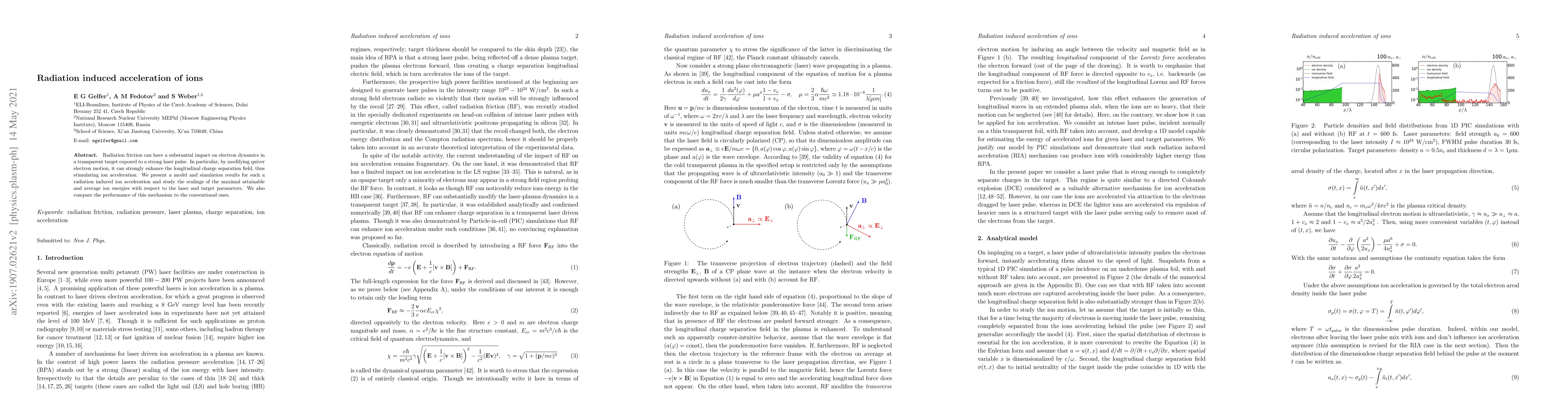 Radiation friction can have a substantial impact on electron dynamics in a transparent target exposed to a strong laser pulse. In particular, by modifying quiver electron motion, it can strongly enhance the longitudinal charge separation field, thus stimulating ion acceleration. We present a model and simulation results for such a radiation induced ion acceleration and study the scalings of the maximal attainable and average ion energies with respect to the laser and target parameters. We also compare the performance of this mechanism to the conventional ones.