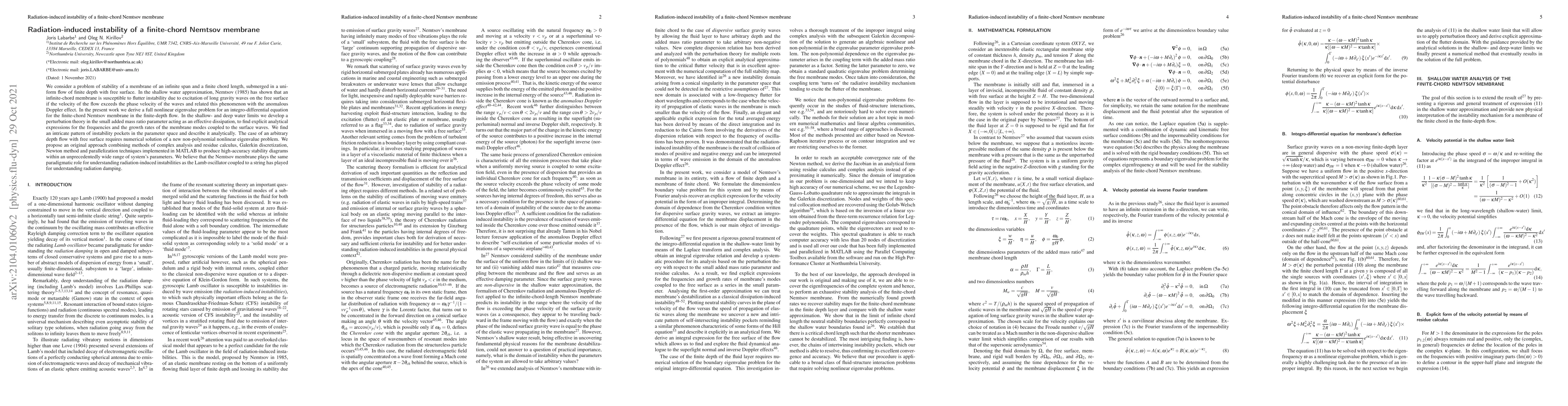 We consider a problem of stability of a membrane of an infinite span and a finite chord length, submerged in a uniform flow of finite depth with free surface. In the shallow water approximation, Nemtsov (1985) has shown that an infinite-chord membrane is susceptible to flutter instability due to excitation of long gravity waves on the free surface if the velocity of the flow exceeds the phase velocity of the waves and related this phenomenon with the anomalous Doppler effect. In the present work we derive a full nonlinear eigenvalue problem for an integro-differential equation for the finite-chord Nemtsov membrane in the finite-depth flow. In the shallow- and deep water limits we develop a perturbation theory in the small added mass ratio parameter acting as an effective dissipation, to find explicit analytical expressions for the frequencies and the growth rates of the membrane modes coupled to the surface waves. We find an intricate pattern of instability pockets in the parameter space and describe it analytically. The case of an arbitrary depth flow with free surface requires numerical solution of a new non-polynomial nonlinear eigenvalue problem. We propose an original approach combining methods of complex analysis and residue calculus, Galerkin discretization, Newton method and parallelization techniques implemented in MATLAB to produce high-accuracy stability diagrams within an unprecedentedly wide range of system's parameters. We believe that the Nemtsov membrane plays the same paradigmatic role for understanding radiation-induced instabilities as the Lamb oscillator coupled to a string has played for understanding radiation damping.