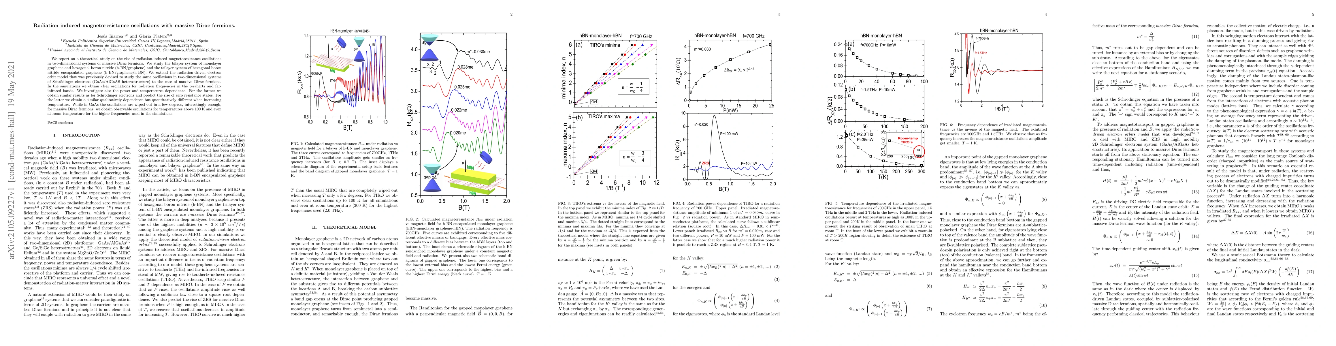 We report on a theoretical study on the rise of radiation-induced magnetoresistance oscillations in two-dimensional systems of massive Dirac fermions. We study the bilayer system of monolayer graphene and hexagonal boron nitride (h-BN/graphene) and the trilayer system of hexagonal boron nitride encapsulated graphene (h-BN/graphene/h-BN). We extend the radiation-driven electron orbit model that was previously devised to study the same oscillations in two-dimensional systems of Schr\"odinger electrons (GaAs/AlGaAS heterostructure) to the case of massive Dirac fermions. In the simulations we obtain clear oscillations for radiation frequencies in the terahertz and far-infrared bands. %which contrasts with the two-dimensional Schrodinger electrons case, %that are mainly sensitive to microwave frequencies. We investigate also the power and temperatures dependence. For the former we obtain similar results as for Schr\"odinger electrons and predict the rise of zero resistance states. For the latter we obtain a similar qualitatively dependence but quantitatively different when increasing temperature. While in GaAs the oscillations are wiped out in a few degrees, interestingly enough, for massive Dirac fermions, we obtain observable oscillations for temperatures above $100$ K and even at room temperature for the higher frequencies used in the simulations.