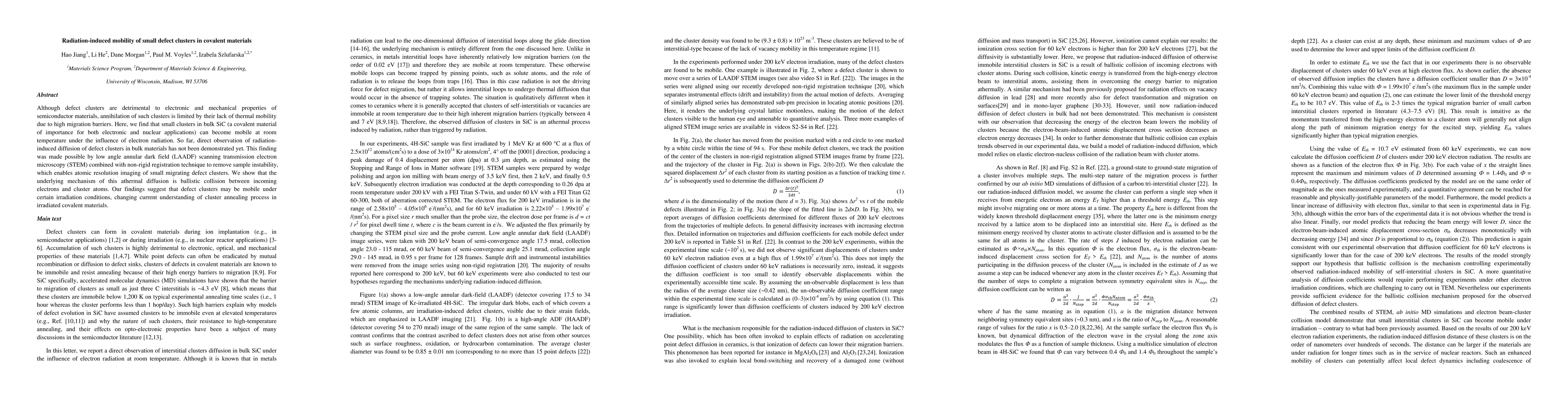 This paper demonstrates that small defect clusters in bulk SiC become mobile at room temperature under electron radiation, facilitated by ballistic collisions between incoming electrons and cluster atoms. This radiation-induced mobility was observed using LAADF STEM and non-rigid registration techniques, challenging current understanding of cluster annealing in irradiated covalent materials.