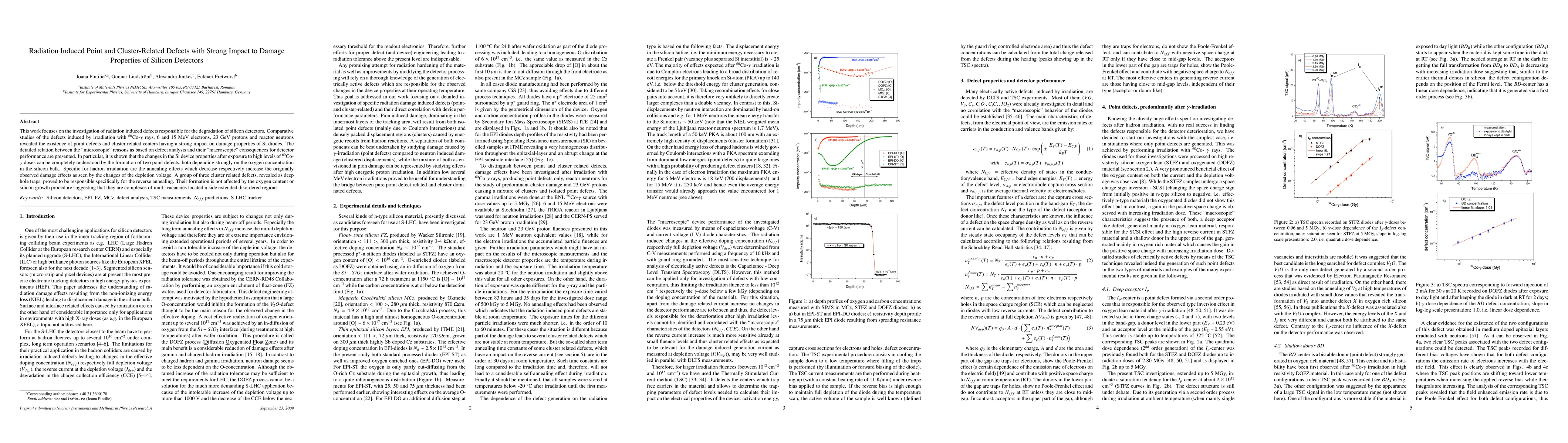 This study investigates radiation-induced defects in silicon detectors, revealing point defects and cluster-related centers significantly impacting Si diode performance. The research highlights the formation of two key point defects influenced by oxygen concentration, and identifies cluster-related deep hole traps responsible for reverse annealing effects.