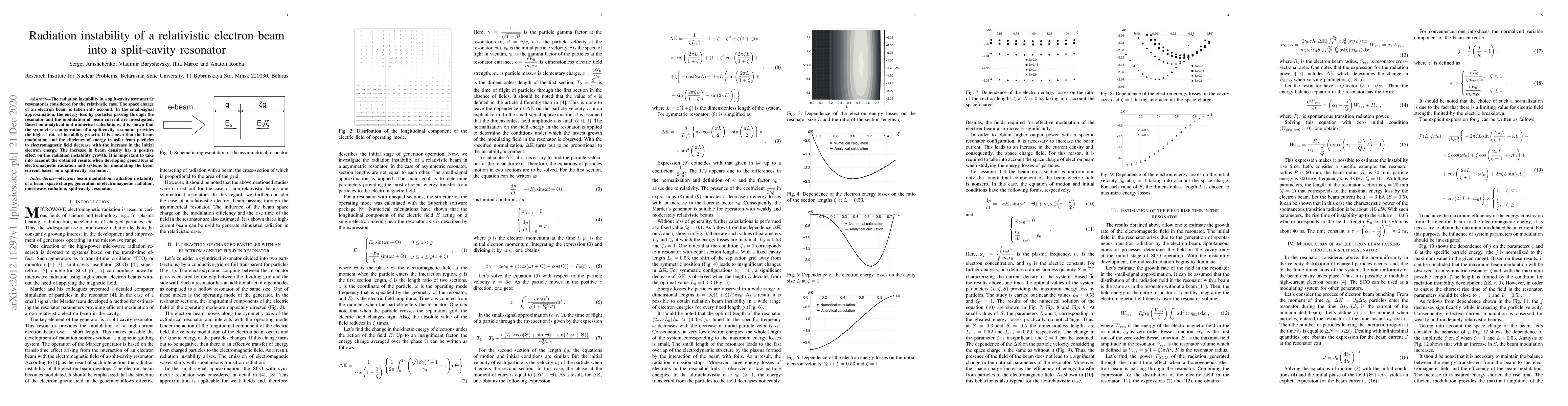 This paper investigates the radiation instability in a relativistic electron beam within a split-cavity asymmetric resonator, finding that the symmetric configuration maximizes instability growth. Higher initial electron energy reduces beam modulation and efficiency of energy transfer, while increased beam density enhances instability.