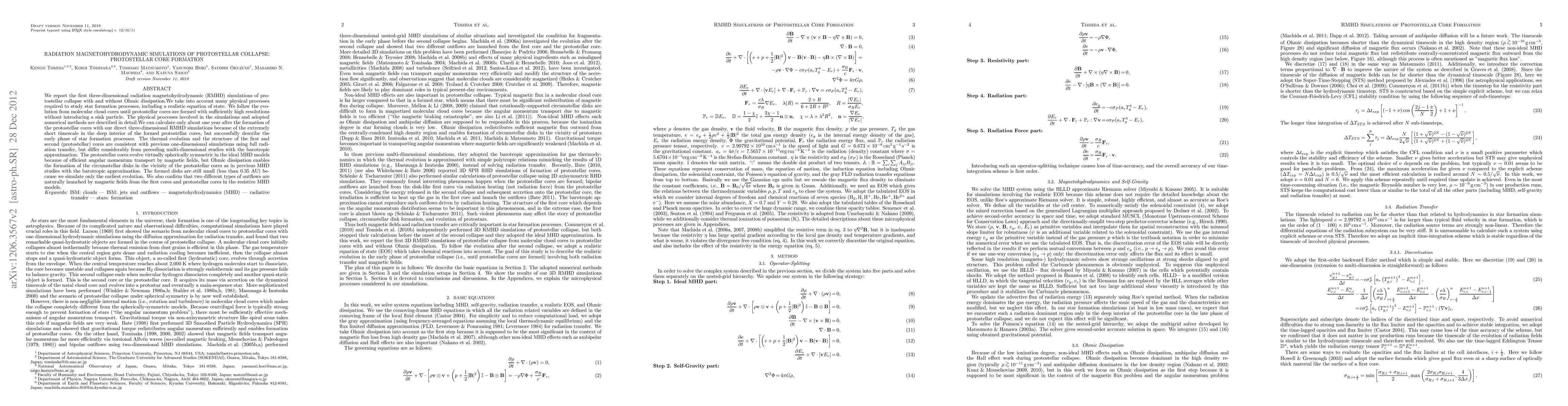 This paper presents the first three-dimensional radiation magnetohydrodynamic simulations of protostellar collapse, detailing the formation of protostellar cores and the role of magnetic fields and Ohmic dissipation in angular momentum transport and disk formation. The simulations reveal spherically symmetric core evolution in ideal MHD models and the emergence of circumstellar disks in resistive MHD scenarios.