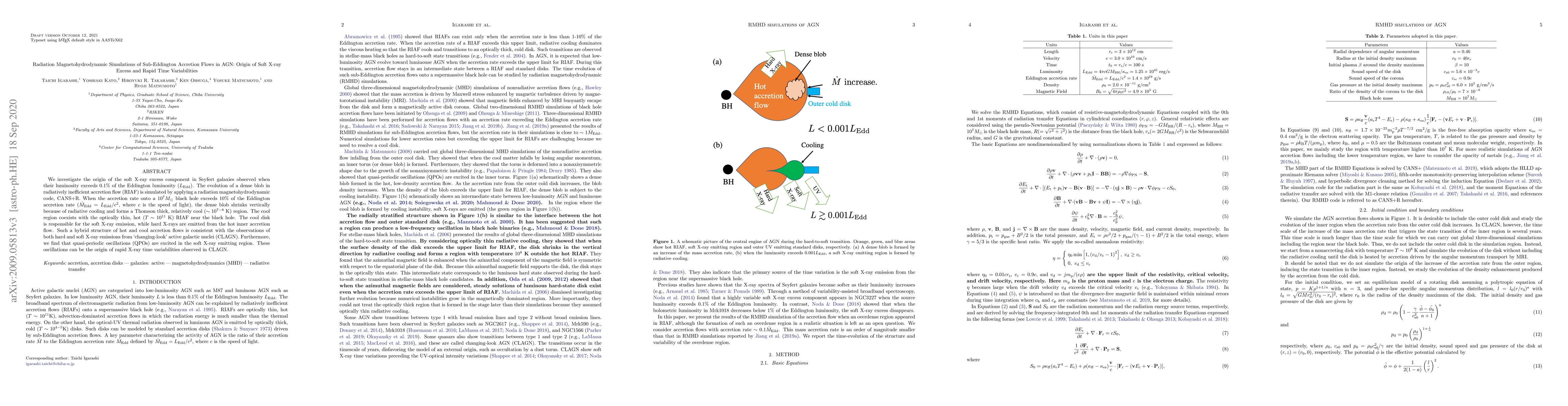 We investigate the origin of the soft X-ray excess component in Seyfert galaxies observed when their luminosity exceeds 0.1% of the Eddington luminosity ($L_{\mathrm{Edd}}$). The evolution of a dense blob in radiatively inefficient accretion flow (RIAF) is simulated by applying a radiation magnetohydrodynamic code, CANS+R. When the accretion rate onto a $10^7M_{\odot}$ black hole exceeds 10% of the Eddington accretion rate ($\dot M_{\rm Edd}=L_{\rm Edd}/c^2$, where $c$ is the speed of light)}, the dense blob shrinks vertically because of radiative cooling and forms a Thomson thick, relatively cool ($\sim10^{7-8}$ K) region. The cool region coexists with the optically thin, hot ($T\sim10^{11}~\mathrm{K}$) RIAF near the black hole. The cool disk is responsible for the soft X-ray emission, while hard X-rays are emitted from the hot inner accretion flow. The soft X-ray emitting region coexists with the optically thin, hot ($T \sim 10^{11}~\mathrm{K}$), radiatively inefficient accretion flow (RIAF) near the black hole. Such a hybrid structure of hot and cool accretion flows is consistent with the observations of both hard and soft X-ray emissions from `changing-look' active galactic nuclei (CLAGN). Furthermore, we find that quasi-periodic oscillations (QPOs) are excited in the soft X-ray emitting region. These oscillations can be the origin of rapid X-ray time variabilities observed in CLAGN.