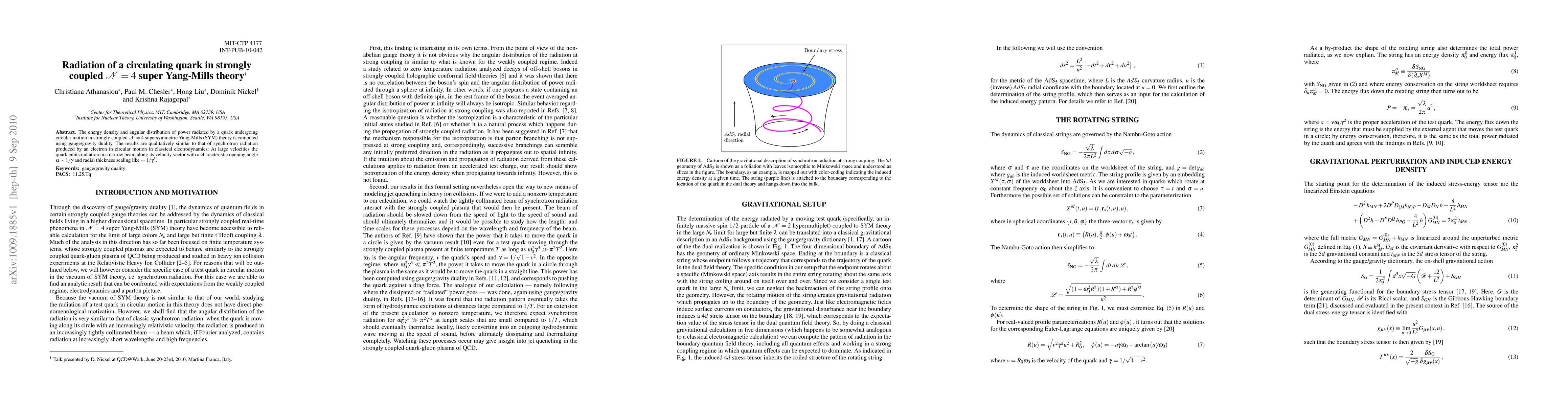 Summary: The study uses gauge/gravity duality to compute the radiation energy density and angular distribution from a circulating quark in strongly coupled N=4 super Yang-Mills theory, revealing synchrotron-like radiation with a narrow beam at high velocities.