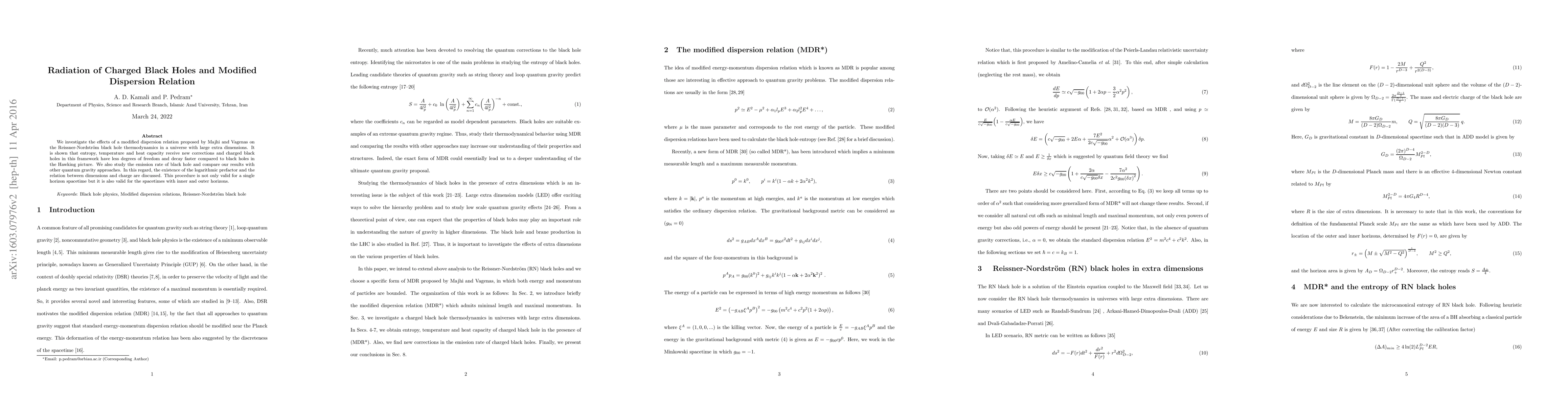 This paper examines the impact of a modified dispersion relation on the thermodynamics of Reissner-Nordstrom black holes in a universe with large extra dimensions, revealing that entropy, temperature, and heat capacity are corrected, leading to faster decay and fewer degrees of freedom for charged black holes compared to the standard Hawking model. The study also compares these findings with other quantum gravity approaches.